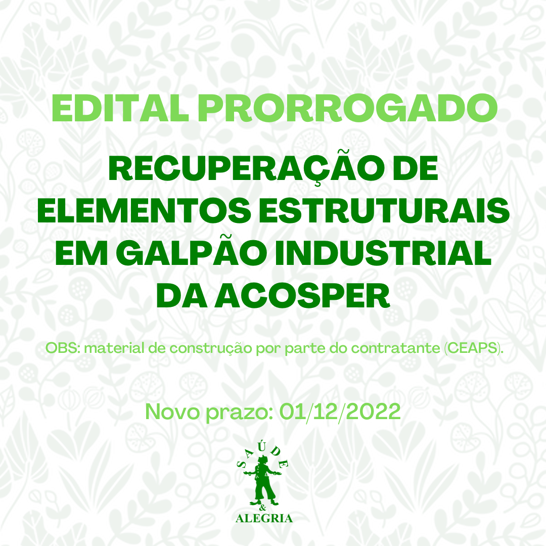 O Centro de Estudos Avançados de Promoção Social e Ambiental – CEAPS torna público o TERMO DE REFERÊNCIA (Nº 048/2022) para contratação de empresa de engenharia especializada para realização de serviços de manutenção, reparo e recuperação de elementos estruturais em …