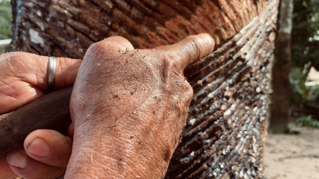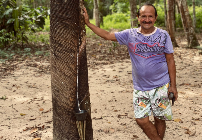 Donildo Lopes dos Santos, carinhosamente conhecido como Dido, é nativo da comunidade Jamaraquá e trabalha desde os 12 anos nos seringais. O saber tradicional herdado do pai o acompanha até hoje na extração da seiva: “comecei a andar com meu pai aqui dentro da mata, aprendendo a trabalhar com borracha porque eu via o meu pai trabalhar. No começo eu só acompanhava, foi com 12 anos que eu comecei a trabalhar com a borracha”, diz.