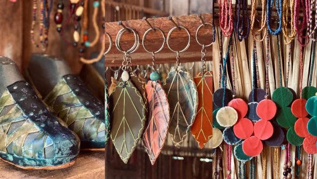 “Aqui em casa minha mulher e meus filhos ficam responsáveis pela criatividade do artesanato, eles montam com sementes, fazem colar, caderno, sapatos. Esses saberes foram passados do meu avô para o meu pai, do meu pai para mim, de mim para os meus filhos, e dos meus filhos já vai para a outra geração”, explica Dido.