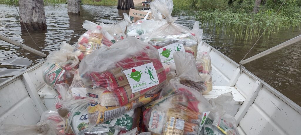 A comunidade que foi apoiada com doações anteriores de cestas de alimentação da campanha em 2020, ápice da pandemia na região, tem cerca de 110 famílias que sobrevivem com atividades extrativistas e de garimpo. Segundo o Presidente da Associação do PAE Montanha e Mangabal, Ageu Lobo, os moradores atendidos receberam as cestas em um momento de extrema necessidade, devido a crise econômica ampliada pela pandemia: “A gente se encontrava numa situação de extrema vulnerabilidade quando a pandemia assolou a região. A nossa comunidade está a 230 km da cidade mais próxima que é Itaituba. Com o apoio das cestas foi possível fazer com que as famílias ficassem mais tempo sem ir na cidade. A gente teve esse apoio em 2020 fazendo esse trabalho de entrega. Não é fácil porque as famílias estão espalhadas a mais de 70 km em linha reta. Porém esse apoio social tem nos ajudado e dado um impacto positivo” – conta.