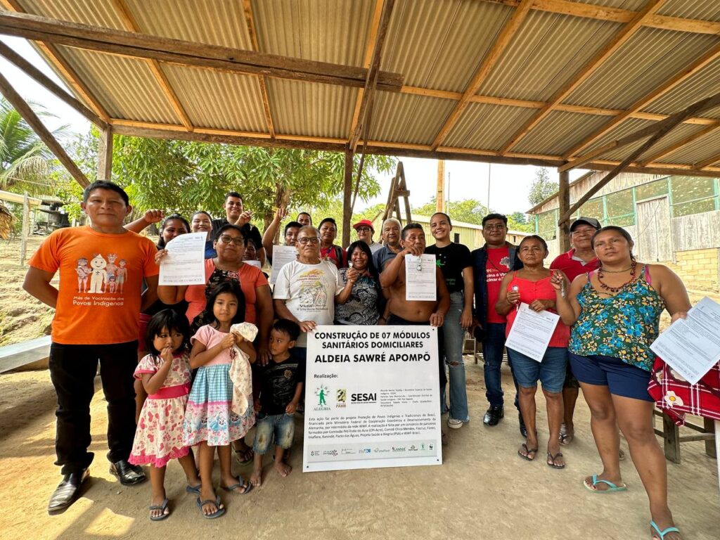 A boa notícia é que uma nova ação do Projeto de Infraestrutura do PSA, concluiu a construção de sete módulos sanitários domiciliares, após uma série de desafios logísticos e operacionais. Por meio do esforço coletivo de lideranças, organizações como a Associação Indígena Pariri – Munduruku, o DSEI Rio Tapajós, FUNAI e Projeto Saúde e Alegria (PSA) com apoio do Projeto Proteção de Povos Indígenas e Tradicionais do Brasil, financiado pelo Ministério Federal de Cooperação Econômica e Desenvolvimento da Alemanha, por intermédio da rede WWF, 59 pessoas de sete famílias foram beneficiadas na aldeia Sawre Apompo.