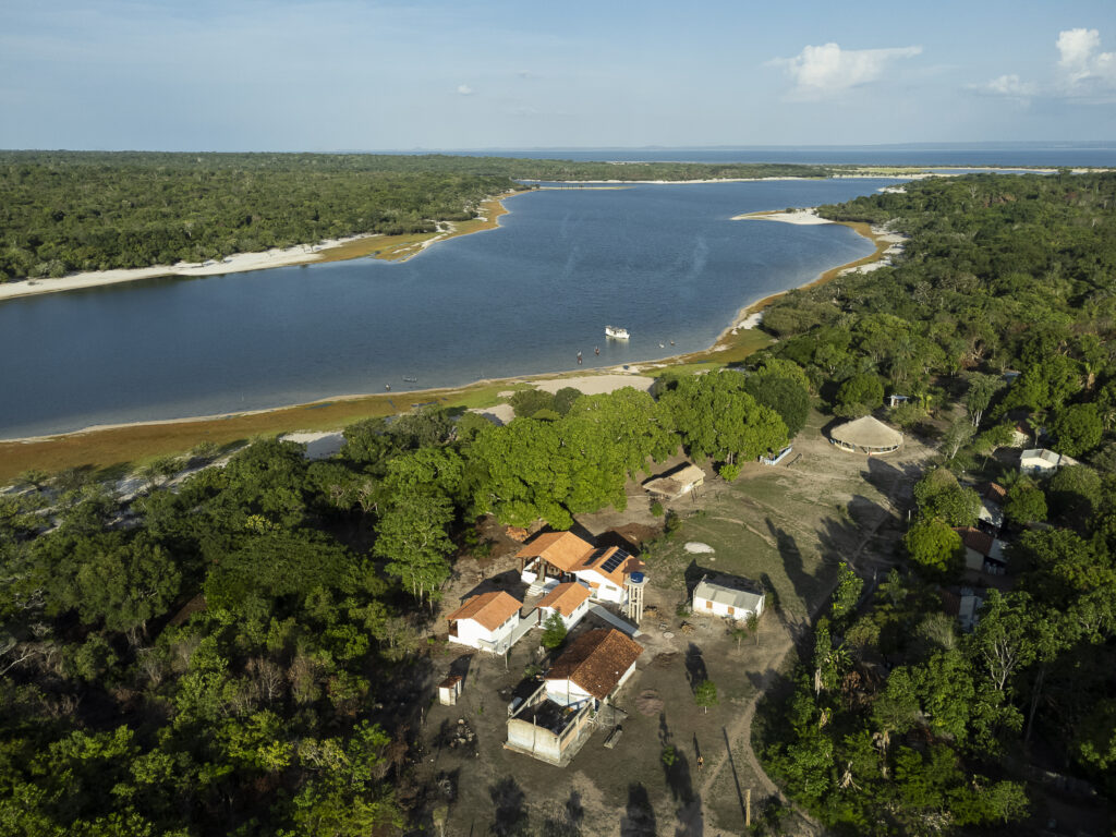 Vista aérea da Pousada Uka Suri com o lago Vista Alegre ao fundo.