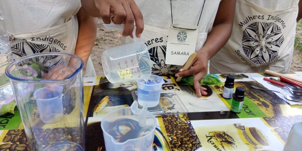A iniciativa da Associação de Mulheres Indígenas Suraras Do Tapajós dividiu o público em duas turmas de dez mulheres nos turnos manhã e tarde, para evitar aglomerações e incentivar a geração de renda sustentável para as populações tradicionais, explicou a coordenadora técnica do projeto, Ianny Borari: “As mulheres que estão sendo treinadas vão ser multiplicadoras. Elas vão poder fornecer para as Suraras do Tapajós produtos de cosméticos e a associação vai vender esses produtos que contam uma história, que tem um peso social e ambiental, além de um compromisso com quem mora na terra e vive dos recursos naturais”.