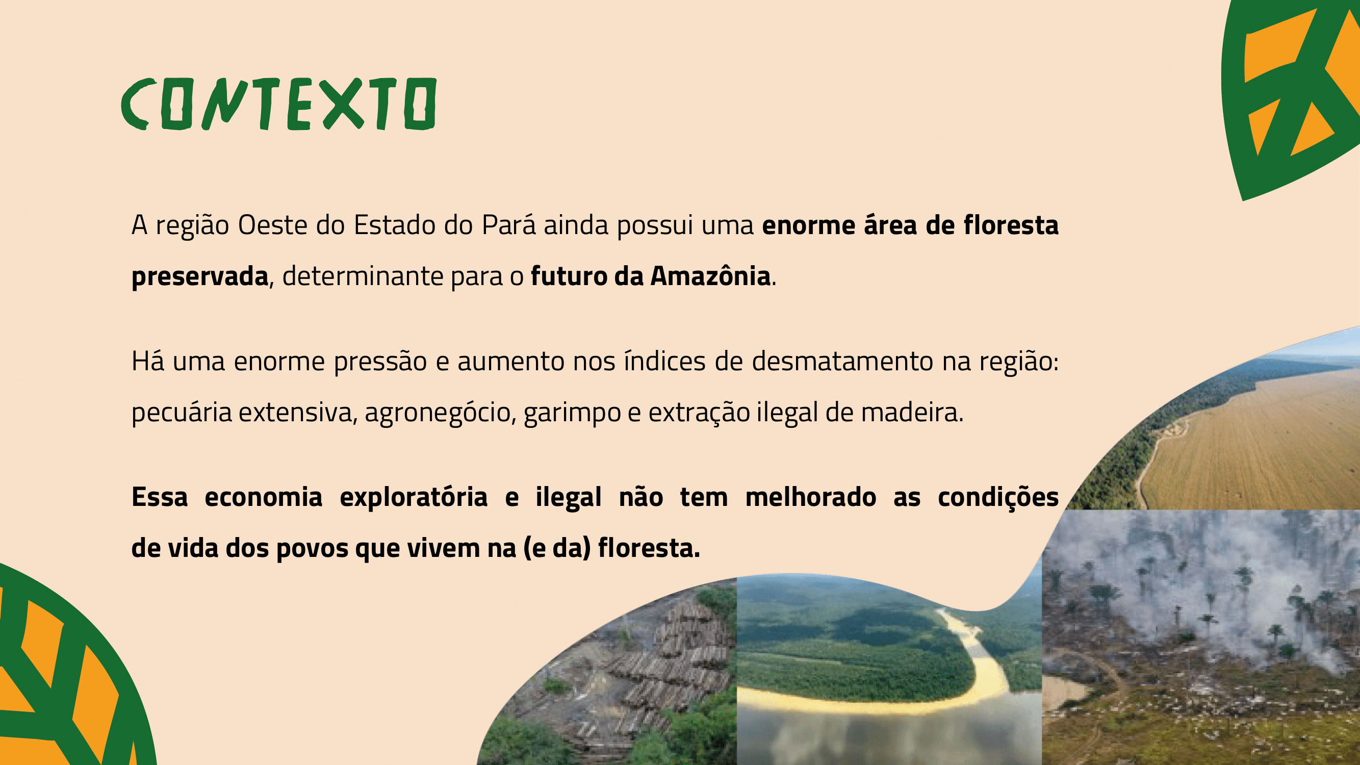 Apesar da região Oeste do Estado do Pará ainda possuir grande área de floresta reservada, há uma enorme pressão e aumento nos índices de desmatamento na região devido a pecuária extensiva, agronegócio, garimpo e extração ilegal de madeira. Essa economia exploratória e ilegal não tem melhorado as condições de vida dos povos que vivem na e da floresta.