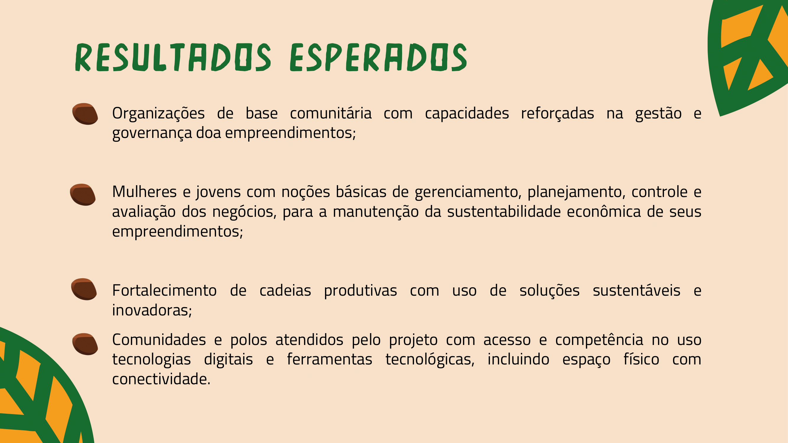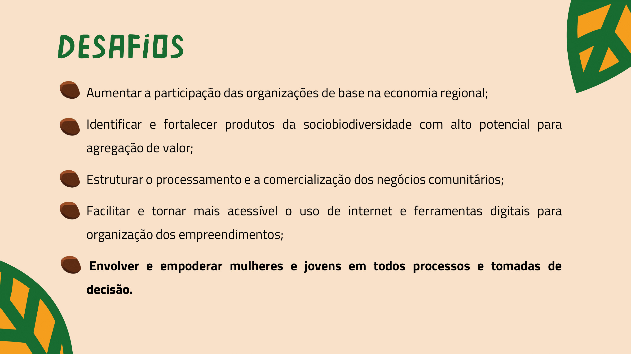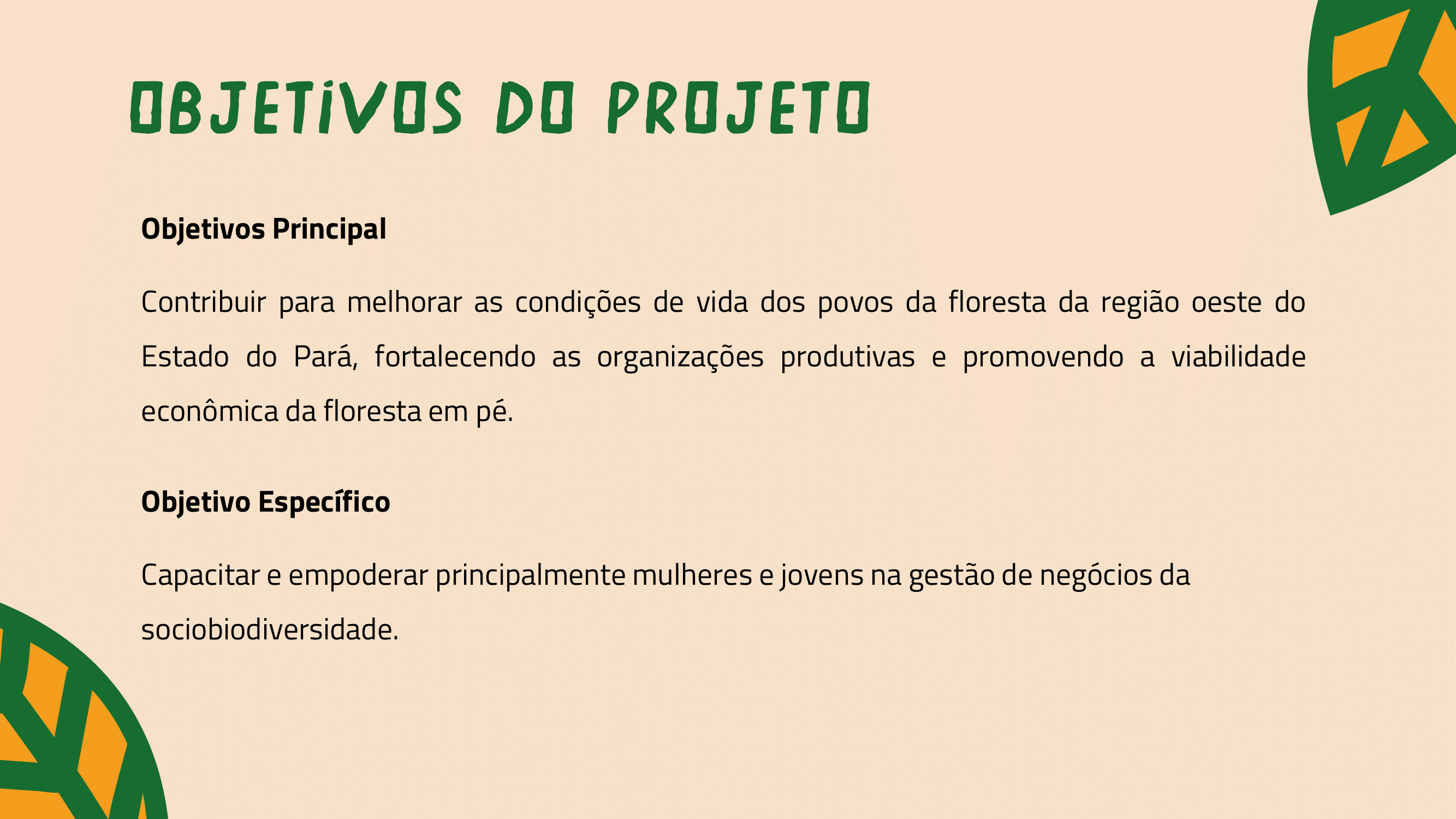 Capacitar e empoderar principalmente mulheres e jovens na gestão de negócios da sociobiodiversidade.