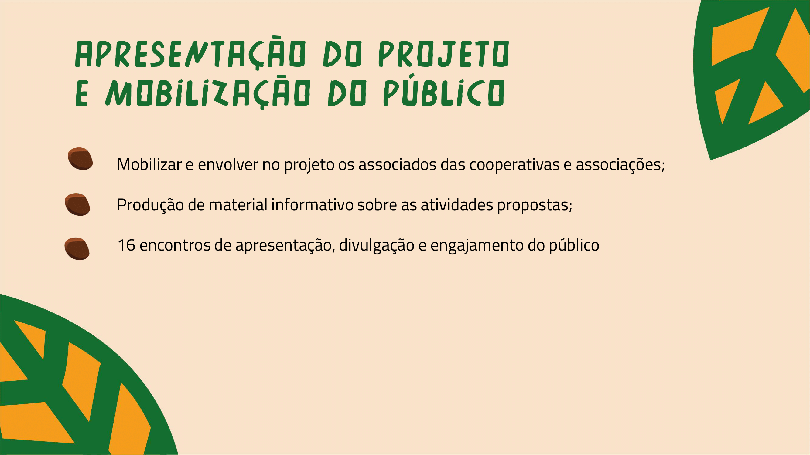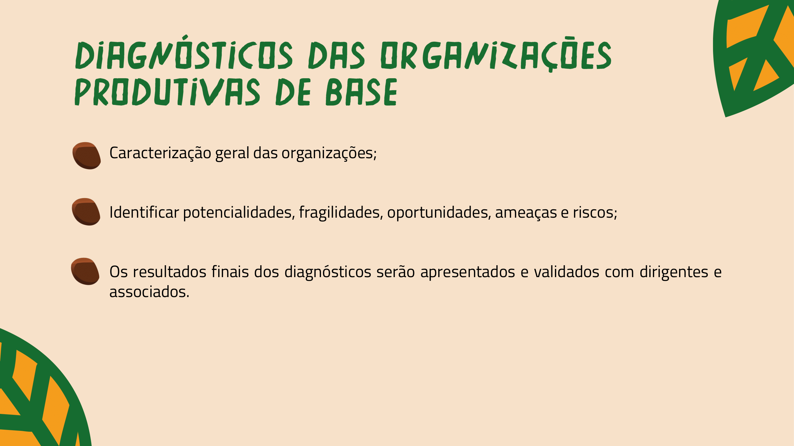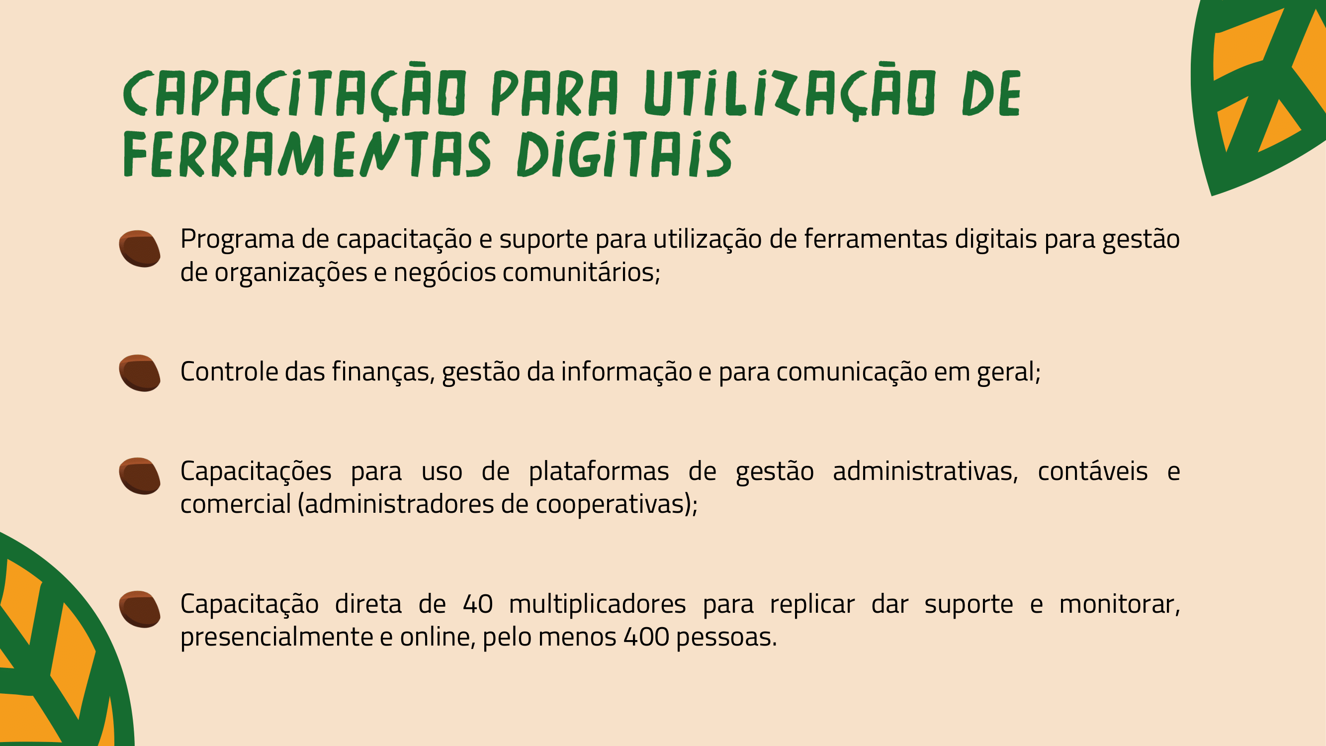 Para isso, é necessário aumentar a capacidade empreendedora das organizações de base comunitária, que em geral apresentam carências no planejamento, na gestão, administração, comunicação e tomadas de decisão sobre seus negócios. O projeto implementa ações como o curso de aprimoramento na gestão e governança de cooperativas e associações, através de um curso aprofundado de dois anos.