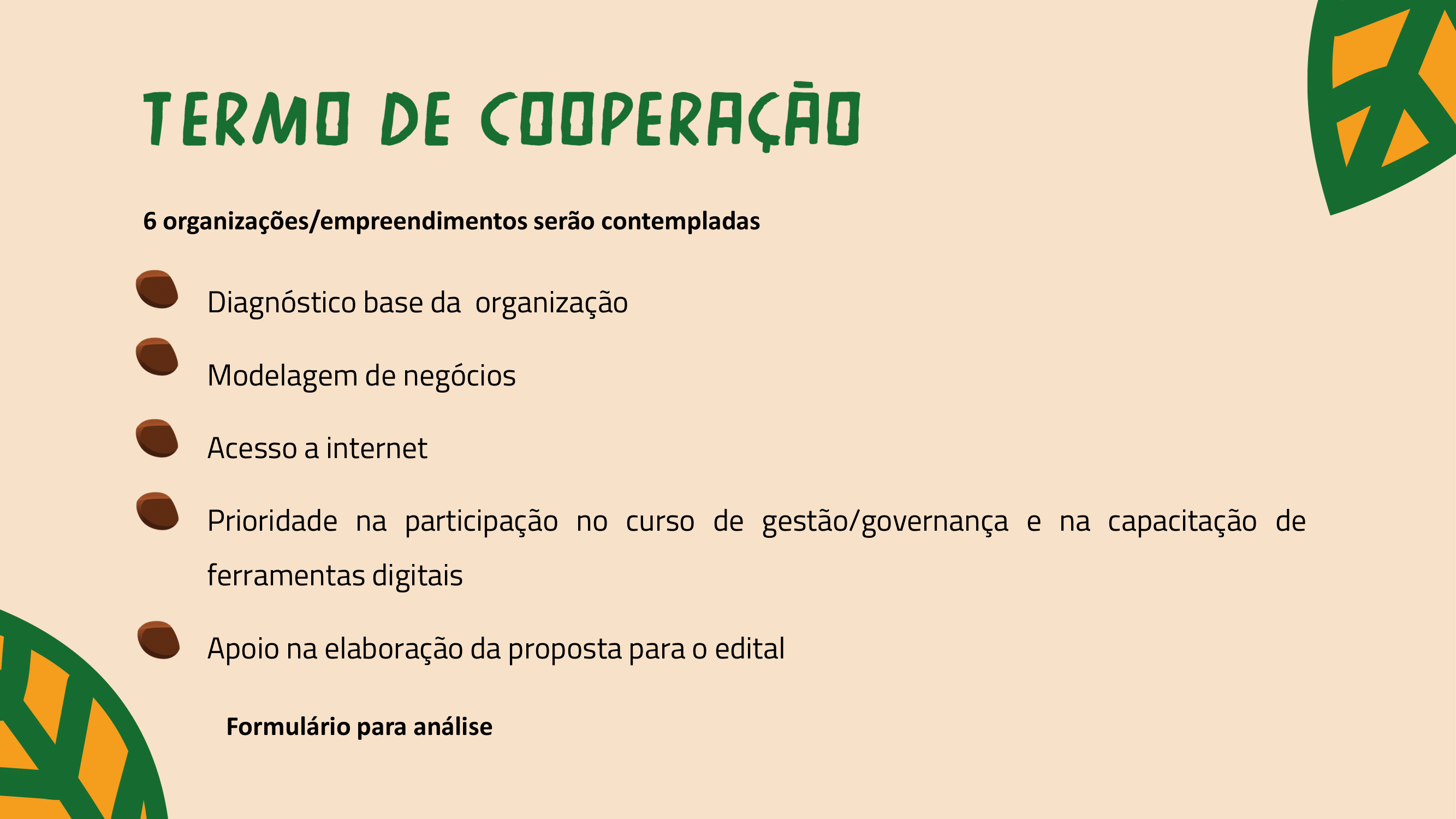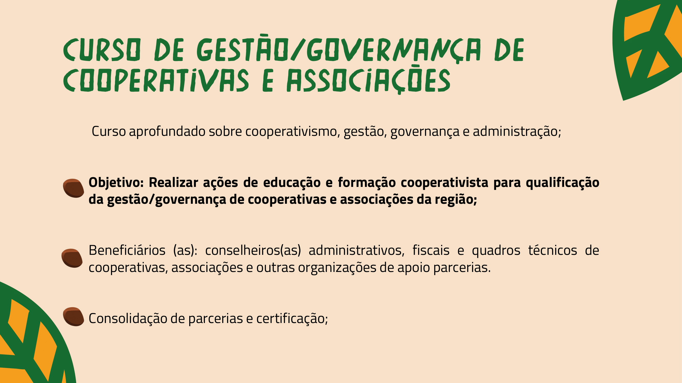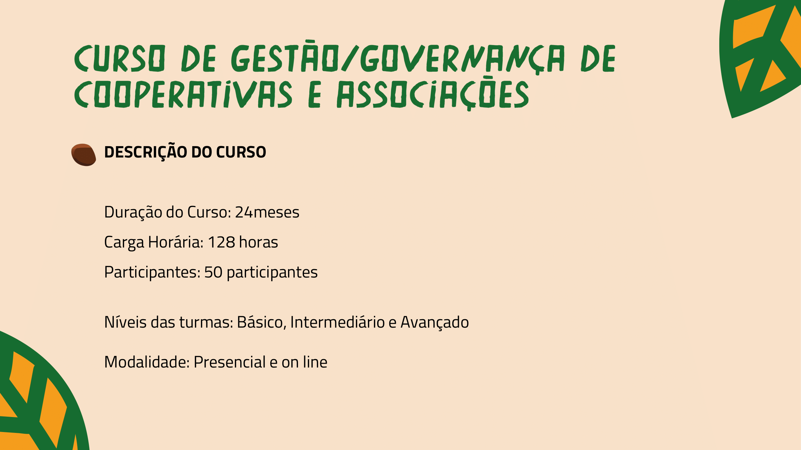 O Curso de Gestão e Governança de Cooperativas e Associações tem como proposta olhar para os principais desafios das organizações de base comunitária do oeste do Estado do Pará e trabalhá-los de forma conjunta. Um dos maiores gargalos para viabilizar e prosperar os negócios comunitários é a gestão, administração e governança das organizações, também é necessário compreender os fundamentos do cooperativismo. E esta educação cooperativista necessita ser empreendedora e financeira, fomentando processos e práticas que promovam empoderamento e criem menos dependência externa.