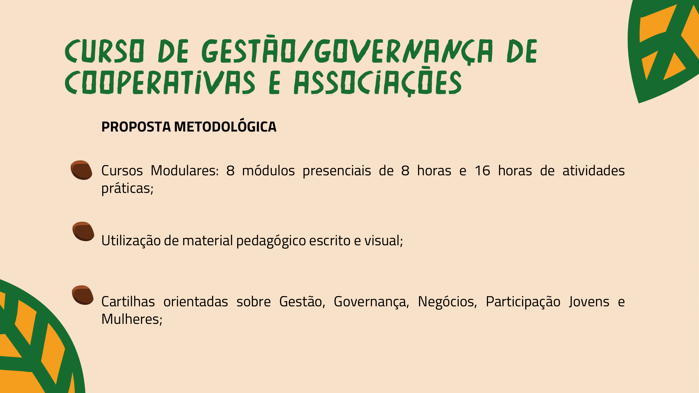 O curso terá a duração de dois anos, as pessoas beneficiárias serão dos quadros técnicos e administrativos, bem como conselheiros e conselheiras de cooperativas, associações e outras organizações de apoio parceiras. Tendo como público prioritário jovens e mulheres. O conteúdo será organizado com foco na criação e gestão do conhecimento, com momentos presenciais e a distância, entre teoria e práticas que serão aplicadas em cada organização, estimulando a participação ativa, despertando a capacidade de análise e de reflexão crítica diante dos cenários e desafios.