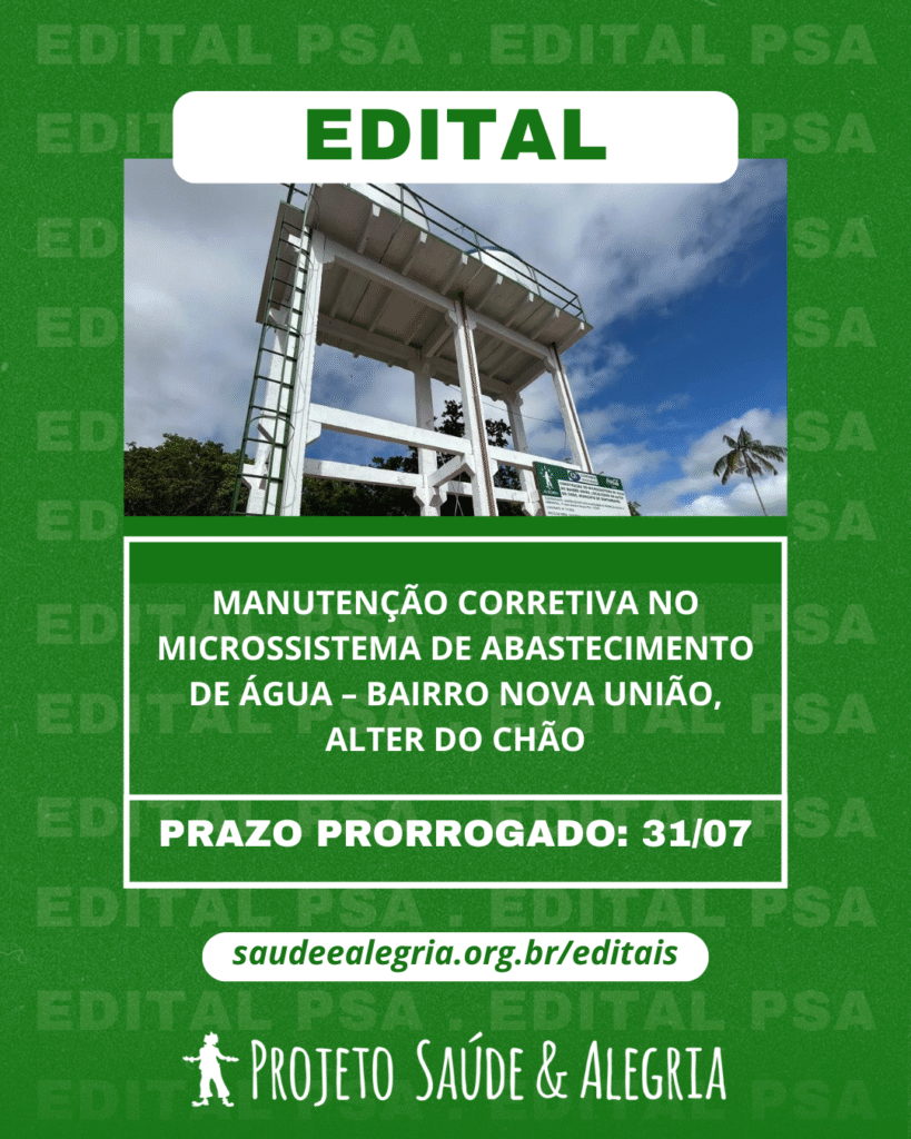 O Centro de Estudos Avançados de Promoção Social e Ambiental – CEAPS torna público o Termo de Referência Nº 037/2025 para contratação de empresa especializada para manutenção corretiva no microssistema de abastecimento de água – Bairro Nova União, Distrito de Alter do Chão.