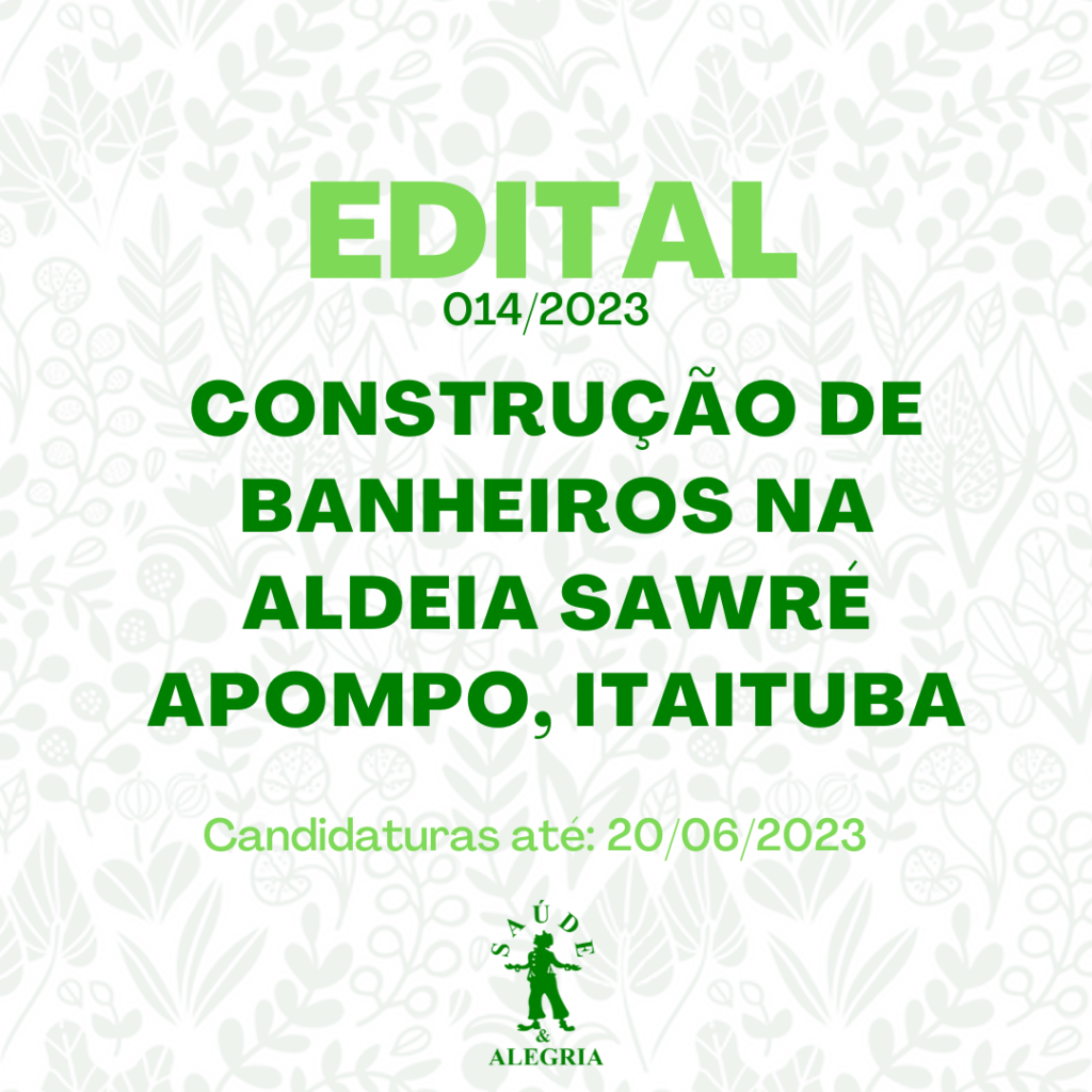O Centro de Estudos Avançados de Promoção Social e Ambiental – CEAPS torna público o TERMO DE REFERÊNCIA (Nº 014/2023) para contratação de empresa de engenharia para a construção de banheiros na aldeia Sawré Apompo, localizada na região do rio Tapajós, Município de Itaituba – PA.