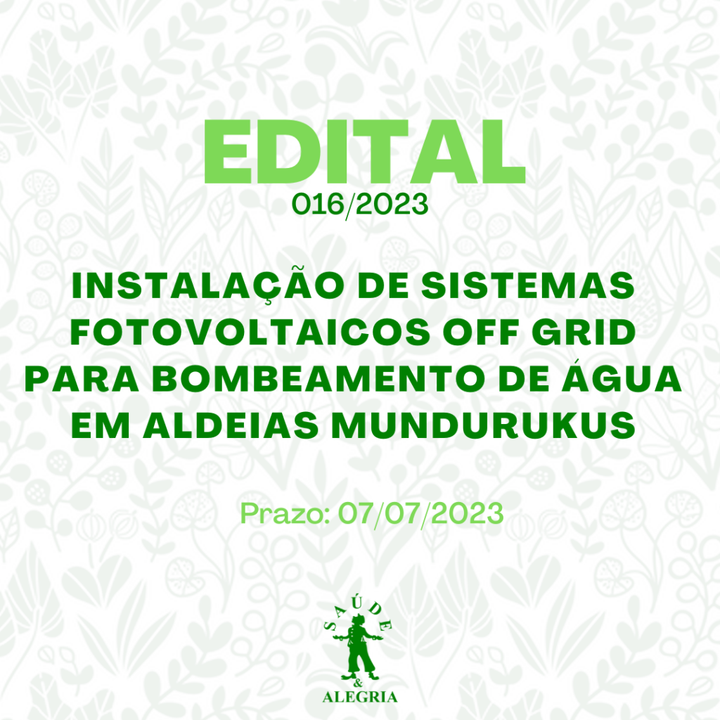 O Centro de Estudos Avançados de Promoção Social e Ambiental – CEAPS torna público o Termo de Referência 016/2023 para contratação de empresa especializada para instalação de sistemas fotovoltaicos off grid para bombeamento de água em 8 aldeias Mundurukus, localizadas na região do alto rio Tapajós, Município de Jacareacanga – PA.