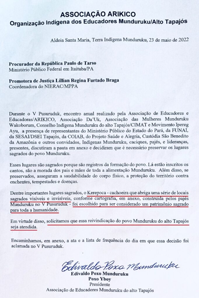 Caciques, pajés, lideranças e educadores Munduruku aprovaram o processo para reivindicar KEREPOCA (“cachoeiras que abrigam lugares sagrados visíveis e invisíveis”) como “Patrimônio Sagrado para toda Humanidade”. Foi construído e deliberado em assembleia o documento formalizando o pedido para iniciar o processo, entregue à Dra. Lilian Braga, representante do Ministério Público presente no encontro.