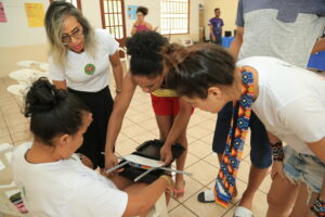Para promover o mapeamento imaginativo do próprio território, os estudantes receberam o acompanhamento da equipe de arte-educação do Projeto Saúde e Alegria. Através do lúdico e das metodologias participativas utilizadas no Gran Circo Mocorongo, as arte-educadoras Elis Lucien, Adriane Gama, Daiane Araújo e Kevin Pascoal auxiliaram na última formação presencial da escola.