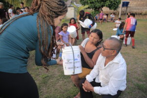Os filtros-baldes representam uma solução prática, eficaz e de baixo custo para tratar a água contaminada. Cada unidade consiste em um balde com uma mangueira que canaliza a água até o cilindro do filtro, onde ocorre o processo de purificação através de uma membrana especial que retém até 99,9% dos vírus, bactérias e impurezas. Uma, explicou a coordenadora do Programa de Infraestrutura Comunitária Jussara Salgado: “Os rejeitos do garimpo vão para esses rios e acabam contaminando a água que eles utilizam para beber, tomar banho e outras atividades domésticas. Esse filtro-balde torna de forma imediata a água imprópria em potável.