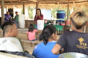 “Pra nós e pra nossa aldeia, é muito importante porque nós não temos poço e a gente economiza água do igarapé. Eu quero agradecer pelo apoio pra nós” – Iris Saw Munduruku, da aldeia Sawré.