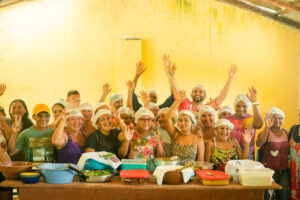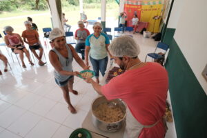 “Fiquei muito feliz de receber essa capacitação e me senti muito grata de aprender coisas que ainda não tinha visto para produzir as comidas para as crianças, e o aproveitamento que a gente não tinha. As vitaminas principais das frutas a gente não aproveitava” – Maria Suely, servente da Escola da Aldeia Takuara.