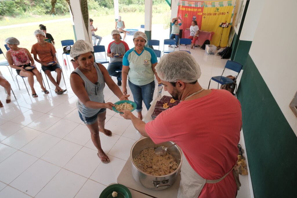 Evitar o desperdício, garantir um bom acondicionamento dos alimentos, usar a criatividade e melhorar a nutrição foram temas da formação realizada no período de 28 a 29 de setembro em comunidades e aldeias da Reserva Extrativista Tapajós Arapiuns e Floresta Nacional do Tapajós. Na primeira etapa, realizada em junho deste ano, profissionais realizaram oficinas sobre higienização, manipulação, preparo, armazenamento e conservação de alimentos, nas comunidades Vista Alegre, Capixauã, Solimões, Pedra Branca, Anumã e Carão na Reserva Extrativista Tapajós Arapiuns. “Falamos sobre higiene, armazenamento, como guardar e manipular esses alimentos, evitando desperdício. Estou muito feliz em participar desse projeto junto com o PSA e representando a ONG Gastromotiva”, ressaltou Nayara Matos, nutricionista.