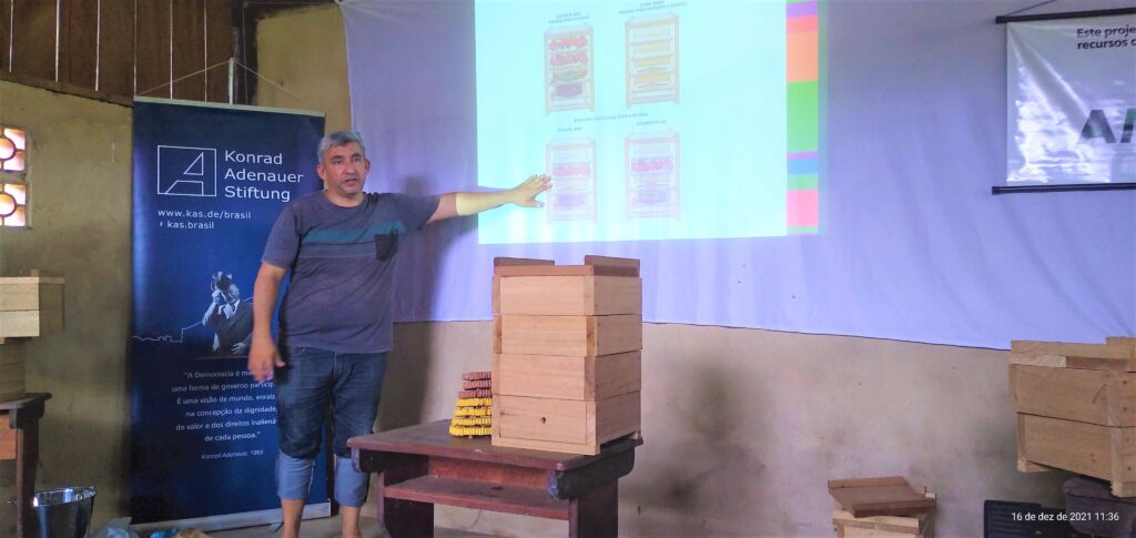 A meliponicultura (manejo racional de abelhas nativas sem ferrão) possui grande potencial para conciliar a proteção da floresta com a geração de oportunidades econômicas para os moradores da floresta. A atividade que proporciona uma renda complementar significativa, apesar de demandar dedicação reduzida, necessita ser aprimorada para se adequar às exigências do mercado para o fornecimento do produto orgânico. Para Eucledison Amorim da comunidade Anã que possui vinte manejadores, participar do encontro foi fundamental para potencializar o trabalho desenvolvido por eles: “Eu fico feliz por estar aprendendo coisas novas. Eu pensava que já sabia tudo, mas na verdade não.  A cada dia a gente vai aprendendo coisas que vão somando ao nosso trabalho” – comenta.