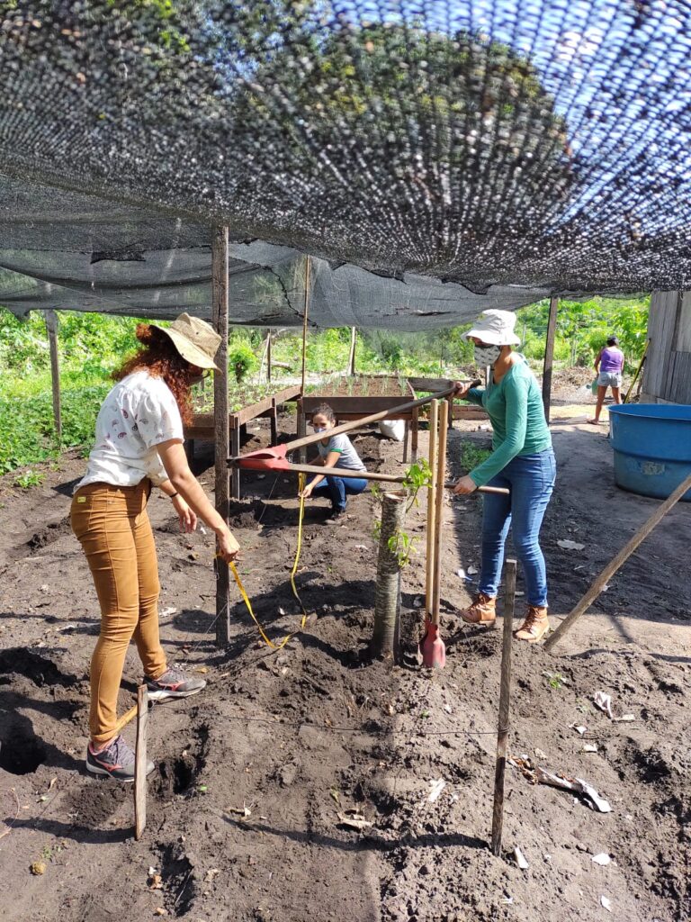 O trabalho com as hortas faz parte de uma estratégia maior do projeto, que envolve a assistência técnica para a criação de Sistemas Agroflorestais – SAFs que hoje conta com a participação de sete comunidades na Resex Tapajós-Arapiuns. Cerca de trinta e cinco famílias atuam na produção de mudas de espécies frutíferas e florestais. Juntas já produziram e plantaram mais de dezoito mil mudas em suas áreas.