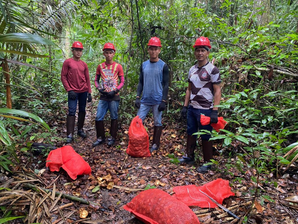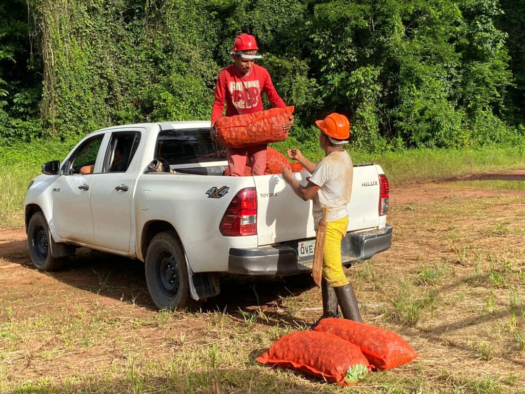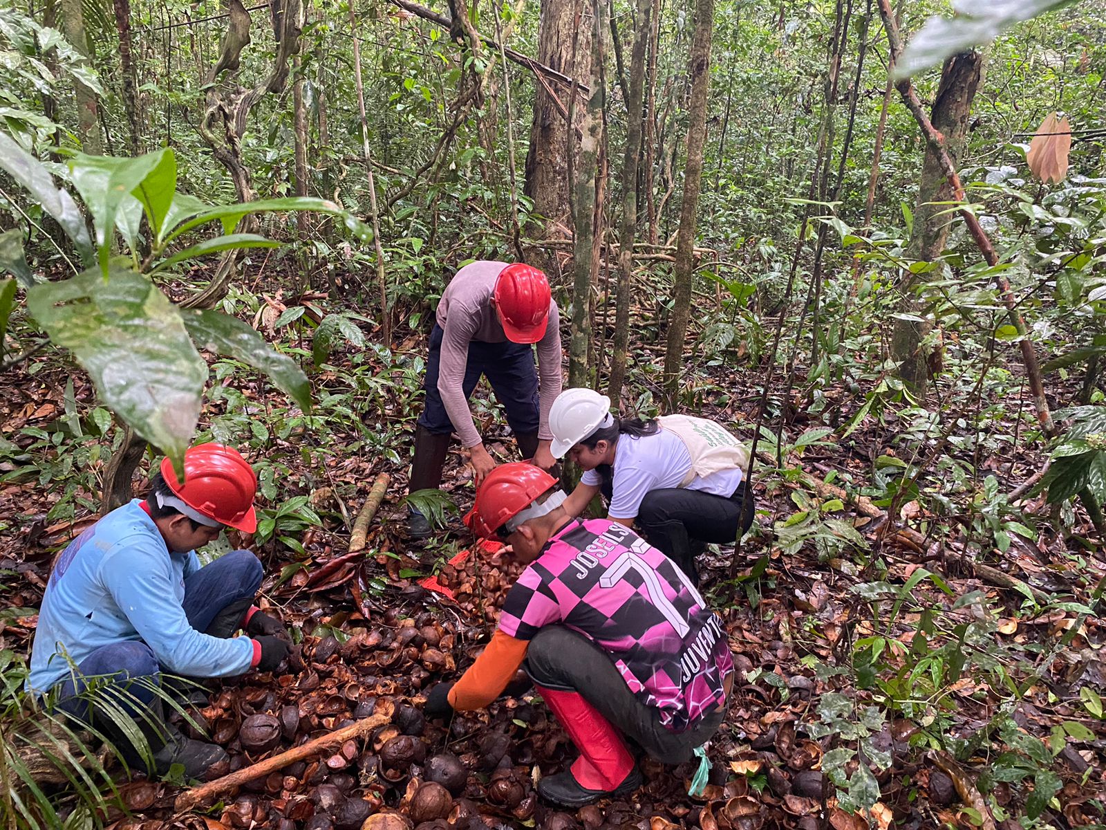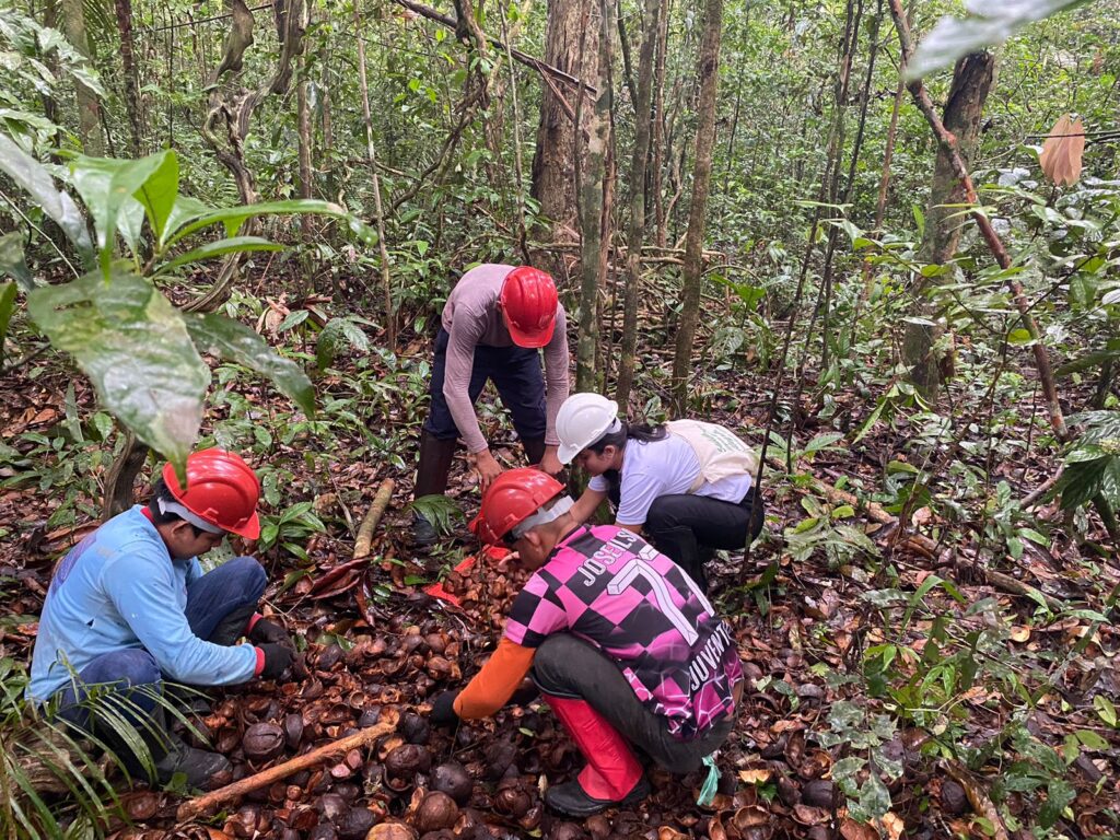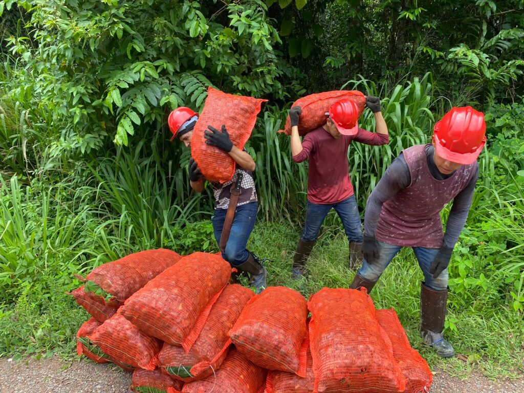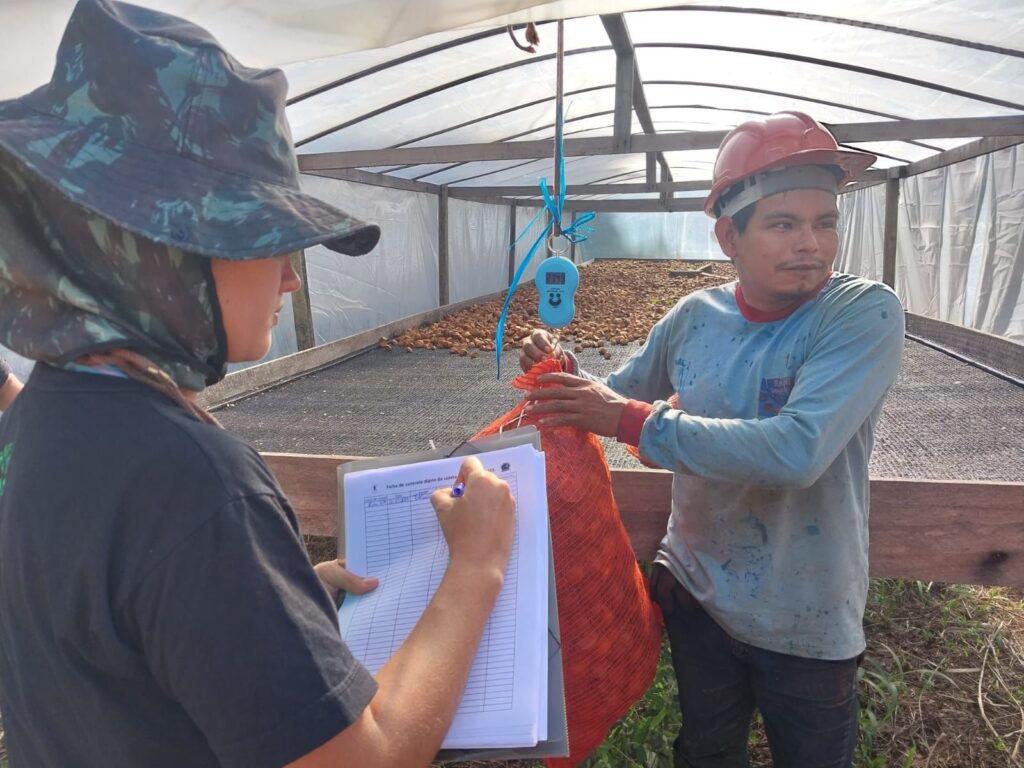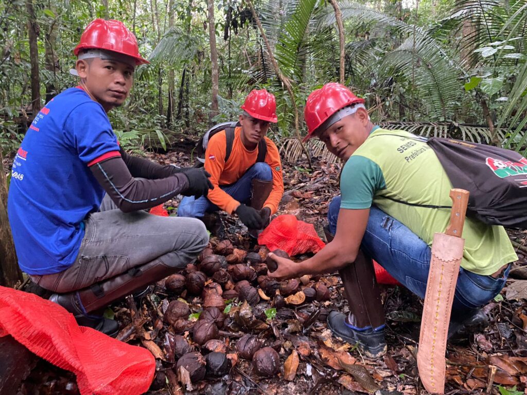 Em campo, o grupo é dividido para ampliar o recolhimento dos frutos caídos no chão, mantendo pelo menos 30% deles na floresta, para que germinem e novas árvores possam crescer. Após o ensaque, são transportados até à base do KM 83 construída com auxílio do Projeto Saúde e Alegria, onde as sementes boas são distribuídas nos secadores.