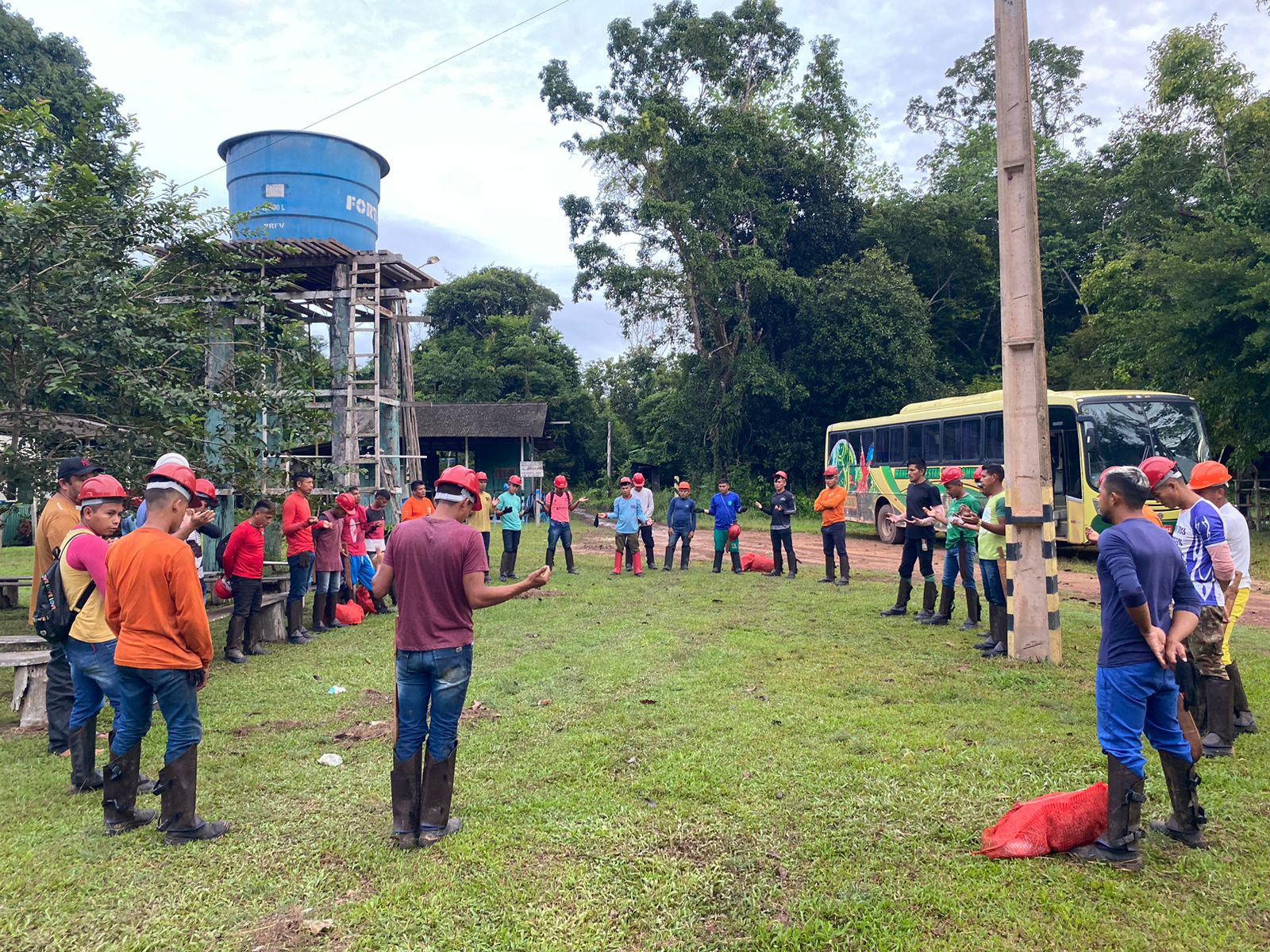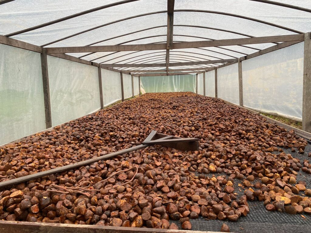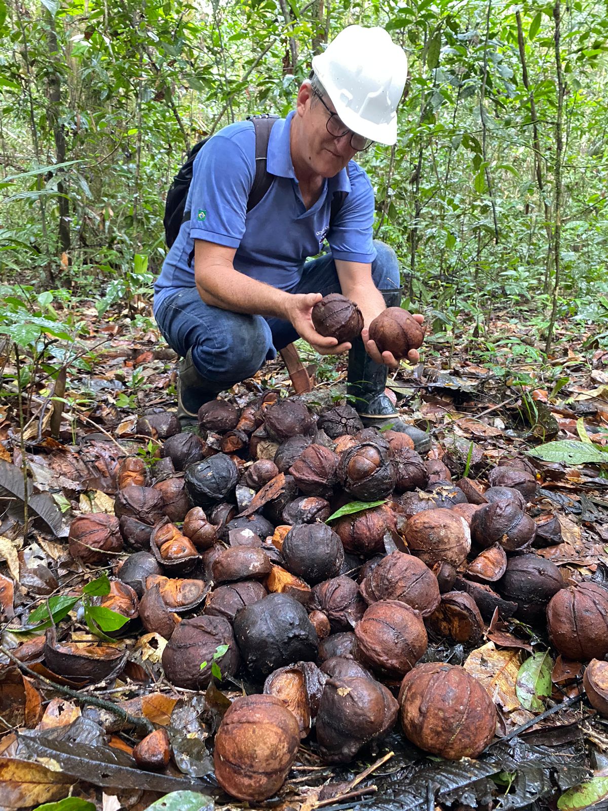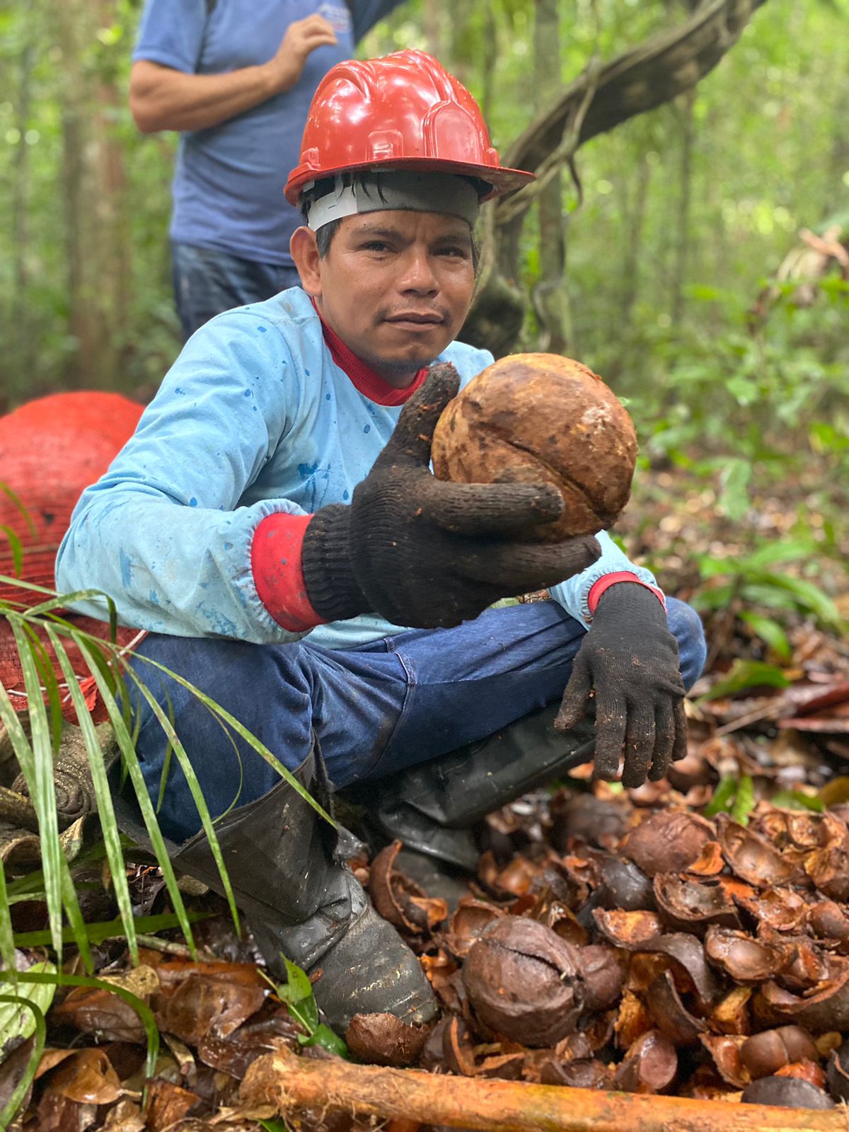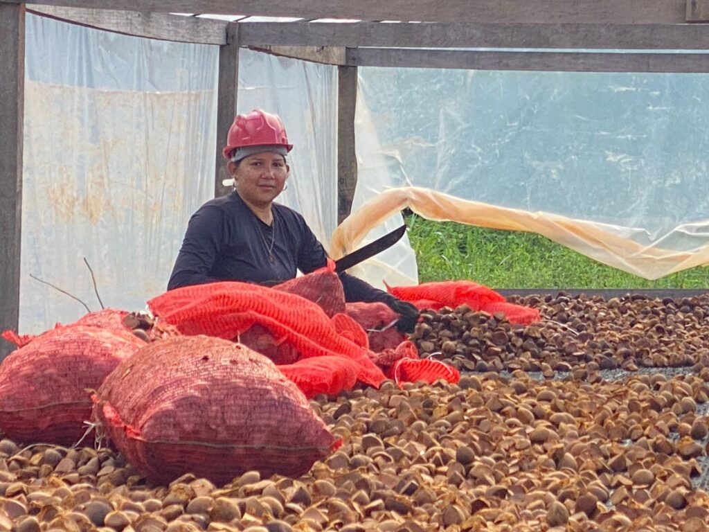 Em campo, o grupo é dividido para ampliar o recolhimento dos frutos caídos no chão, mantendo pelo menos 30% deles na floresta, para que germinem e novas árvores possam crescer. Após o ensaque, são transportados até à base do KM 83 construída com auxílio do Projeto Saúde e Alegria, onde as sementes boas são distribuídas nos secadores.