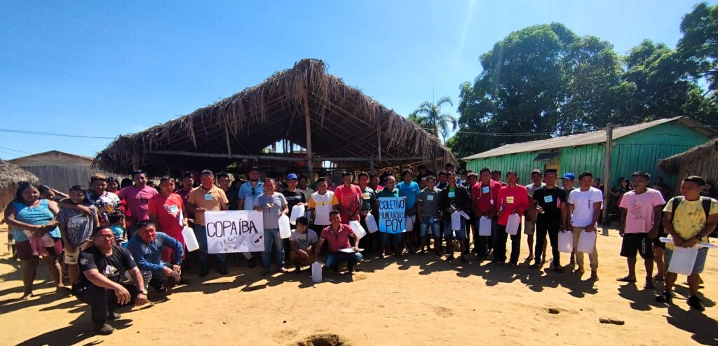 A oficina de boas práticas e manejo do óleo/resina de Copaíba realizada no período de 18 e 20 de junho na Aldeia Pratati, região da Terra Indígena Munduruku em Jacareacanga-Pará, reforçou técnicas sustentáveis de extração. O encontro de formação teve como objetivo capacitar os participantes no manejo sustentável da copaíba, destacando a importância da conservação ambiental e social. Durante a programação, membros do Coletivo Poy compartilharam experiências e estratégias para o manejo da espécie que é popularmente conhecida como antibiótico da mata, sendo muito utilizada na Amazônia com fins medicinais.