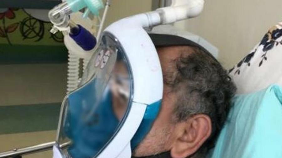 Paciente usa máscara de mergulho para realização da ventilação não invasiva na Fundação Santa Casa de Misericórdia do Pará.
