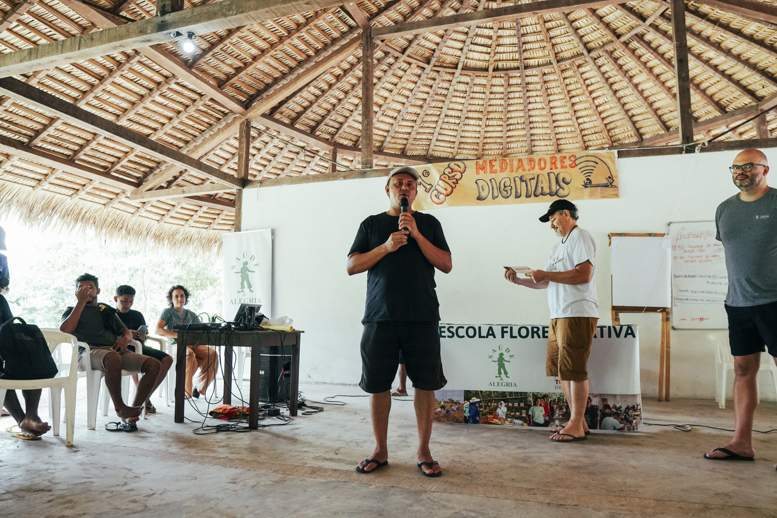 Emocionado em testemunhar o curso de mediadores digitais. É mais um esforço de fazer chegar tecnologia de ponta na ponta, mas nada adianta se a gente não faz um processo de cocriação com as comunidades capacitando uma rede de agentes comunitários em tecnologias de informação para que eles possam irradiar isso nas aldeias das comunidades e trabalhando a autogestão de empreendimentos de comunicação, internet e telecentro para fazer o melhor uso de tecnologia”.