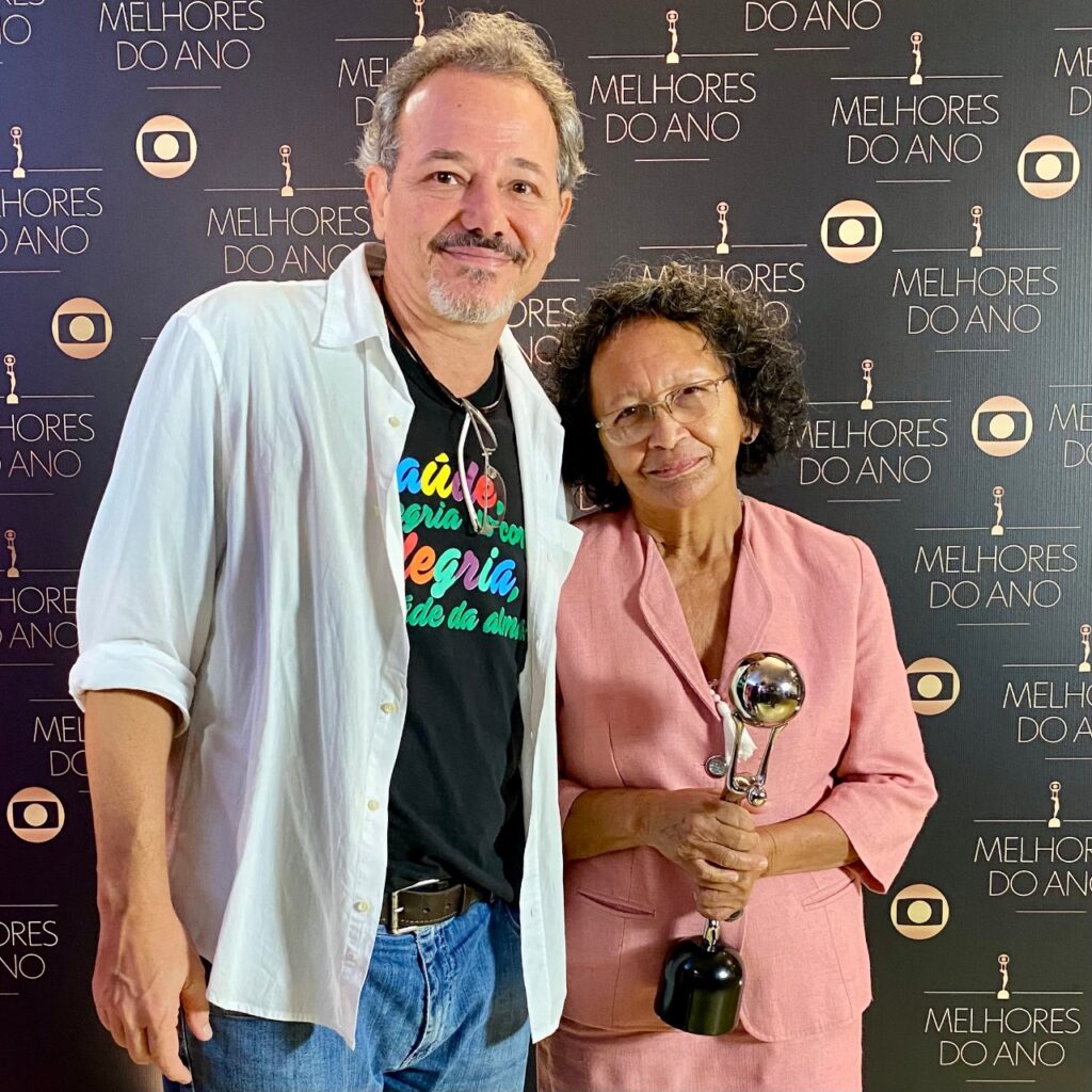 Maria Odila e Caetano Scannavino nos estúdios Globo, durante entrega do prêmio Melhores do Ano 2021.