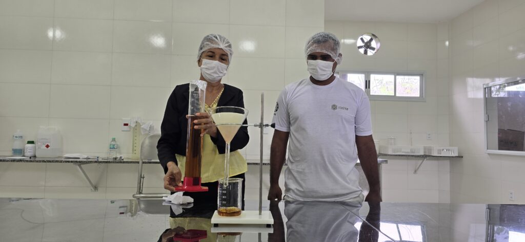 A formação contribui para agregar valor ao própolis coletado nos meliponários, ampliando a oferta de produtos derivados das abelhas sem ferrão e promovendo alternativas sustentáveis de geração de renda. A proposta é fortalecer a cadeia produtiva da meliponicultura, promovendo capacitação técnica desde a coleta correta do própolis até o beneficiamento e finalização do extrato, dentro dos parâmetros legais. A oficina foi conduzida pelo consultor Jerônimo Vilas Boas, especialista em produtos das abelhas. “Estamos estudando as características e os compostos bioativos do própolis. Basicamente, o material é triturado, passa por um processo de maceração em álcool, que extrai os compostos da própolis bruta, e depois por filtragem e concentração até atingir os requisitos legais. Um dos requisitos é que ele tenha no mínimo 11% de concentração e no máximo 70% de álcool de cereais.”