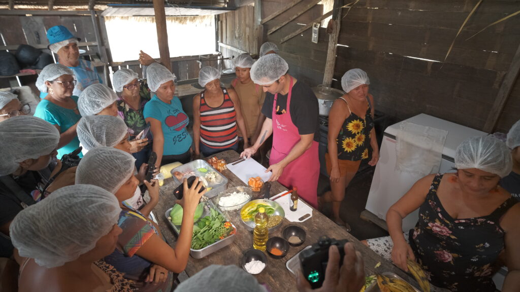 “A comida alimenta o corpo, o corpo alimenta a alma e a alma nos conecta”. Com este lema, as oficinas foram implementadas em Santarém e possibilitaram aos participantes criar receitas nutritivas com alimentos básicos. A iniciativa do PSA, Gastromotiva e ONG Banco de Alimentos, oportunizou meios para alimentação saudável e novas formas de geração de renda para comunidades tradicionais que também atuam com receptivos turísticos. “A gente já recebe o turismo há vinte anos e a cada dia a gente vem inovando. E hoje nós aprendemos principalmente a aproveitar os alimentos que a gente descartava e isso para o turismo de base comunitária é muito importante” – acrescentou Kenedy Colares, diretor da escola da aldeia.