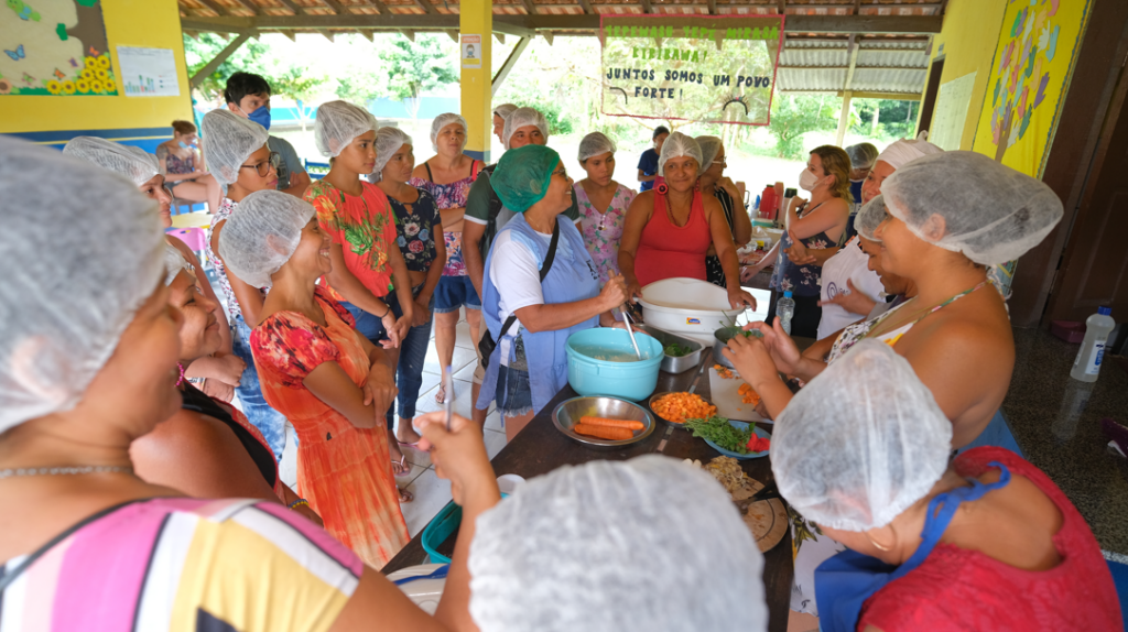 As oficinas iniciaram no dia 6 de junho com mulheres do Instituto de Mulheres e Cooperativa de reciclagem do Perema na creche Seara na área urbana de Santarém e seguiram até 10 de junho, atendendo comunitários de Vista Alegre, Capixauã, Solimões, Pedra Branca, Anumã e Carão na Resex. “Foi um momento de muita troca de saberes sobre alimentação, resistência e território para fortalecer a segurança alimentar, falando de saúde e alegria, geração de renda, permanência e fortalecimento” – considerou Renata Peixe-Boi da ONG Gastromotiva.