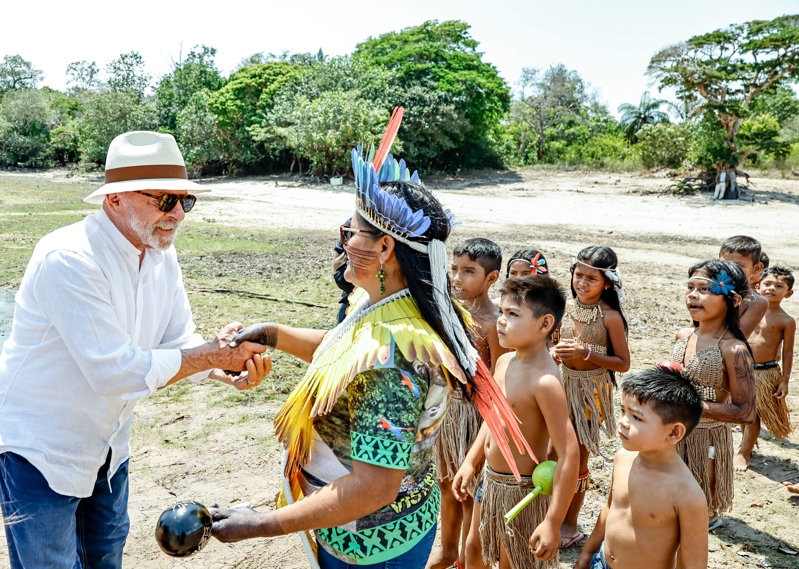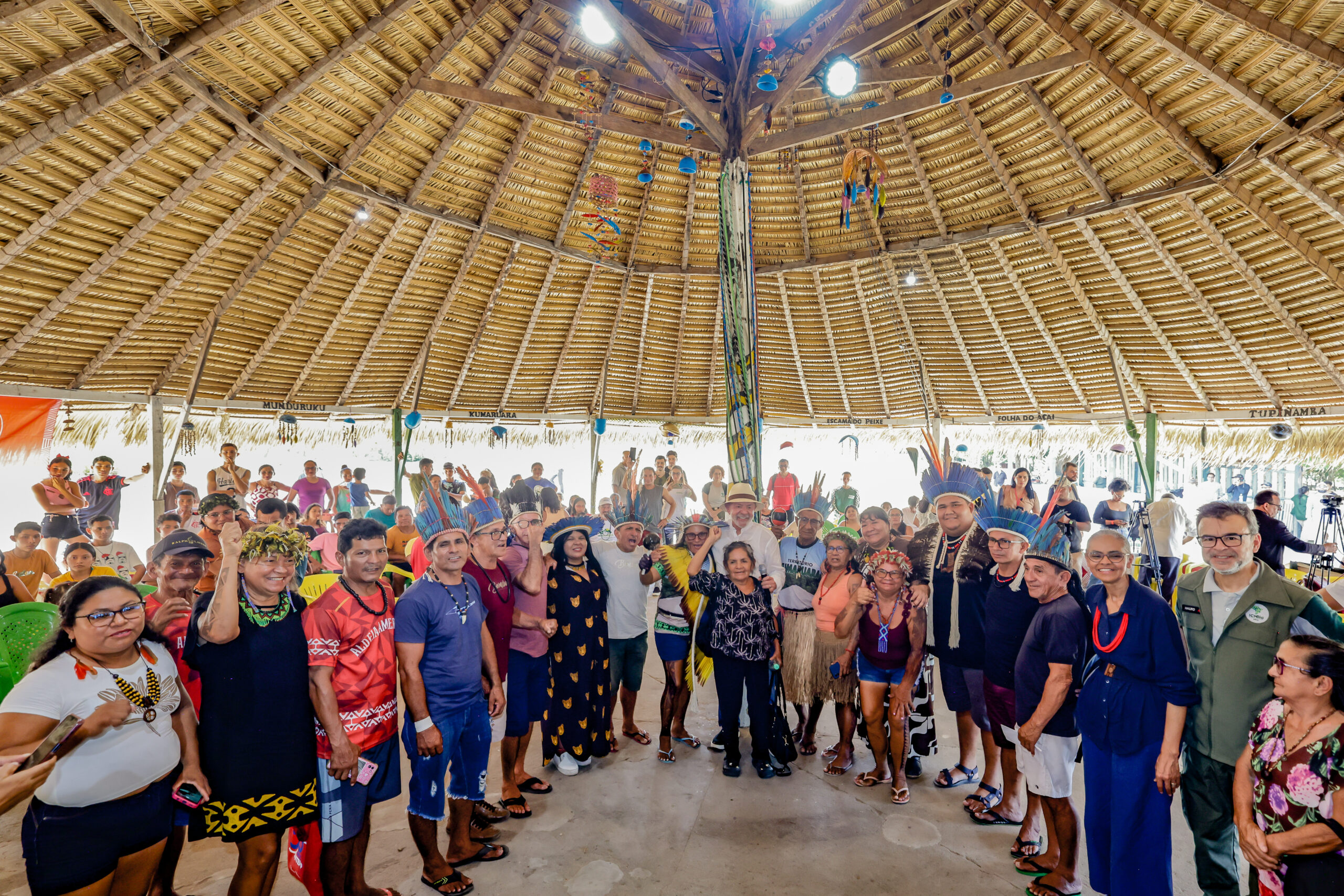 O presidente Luiz Inácio Lula da Silva visitou neste domingo (2) comunidades indígenas e ribeirinhas da região do Tapajós, no oeste do Pará, acompanhado também da primeira-dama Janja, as ministras Sonia Guajajara (Povos Indígenas) e Marina Silva (Meio Ambiente e Mudança do Clima), da presidente da Funai, Joenia Wapichana, e do ICMBIO, Mauro Pires.