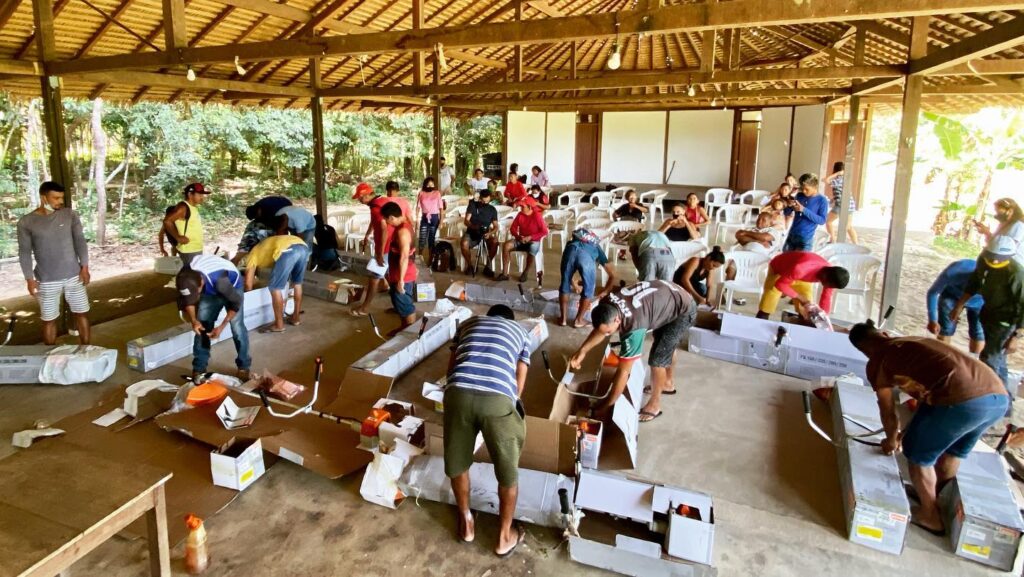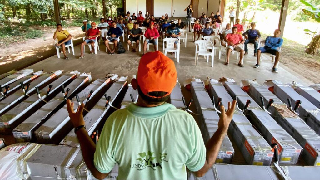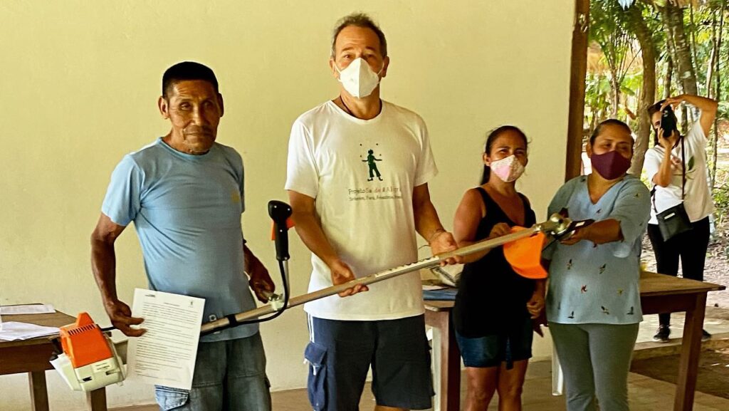 A atividade integra a estratégia do Programa Floresta Ativa do Projeto Saúde e Alegria, com apoio da Natura, BNDES/Fundo Amazônia, Fundação Good Energies e parceria da Acosper. No encontro, os produtores receberam roçadeiras, insumos e o pagamento da primeira parcela de apoio financeiro para suporte aos trabalhos: “os equipamentos são direcionados às atividades que serão desenvolvidas dentro dos roçados: roçadeira, calcário, adubo orgânico, para que a gente consiga implementar todas as técnicas e melhorar a produtividade dessas áreas. Todas as famílias estão recebendo milho para fomentar a produção de alimentos nesses lotes, para vender e consumo familiar” – ressaltou o coordenador da atividade, Márcio Roberto.