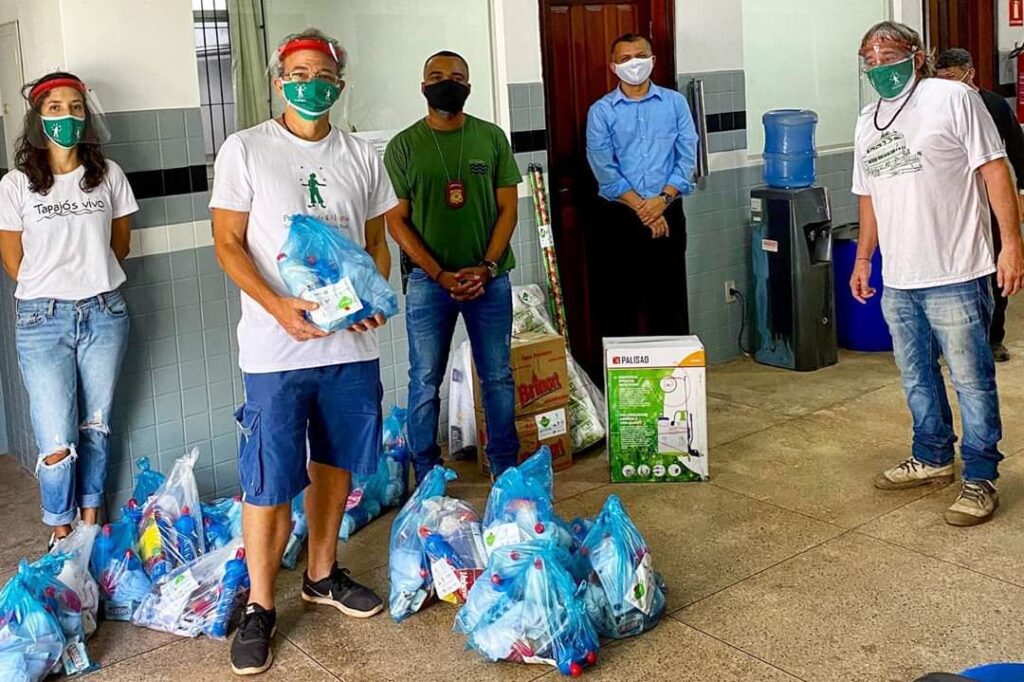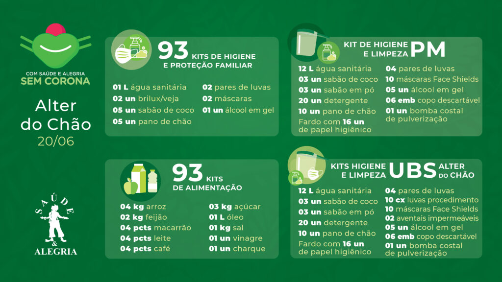 Realizada em 20/06, a ação, fruto de diversas parcerias, incluiu entrega de 170 kits de higiene e alimentação para famílias indígenas e de catraieiros em situação de vulnerabilidade; 1 kit com 106 itens para a Unidade Básica de Saúde; 1kit com 83 itens de materiais de higienização e 21 kits de proteção para agentes da base integrada da polícia; entrega de 10 mil máscaras cirúrgicas produzidas pelas costureiras da Vila para proteção dos profissionais de saúde de Santarém;