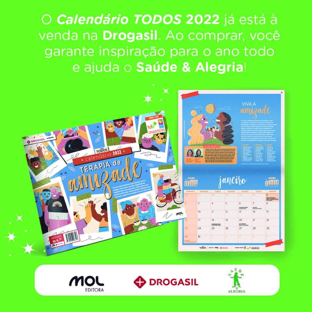 O Calendário TODOS 2022 já está à venda na Drogasil, e este ano vem cheio de conteúdo sobre a importância de ter amigos por perto! Com lindas ilustrações e textos sobre o tema, o calendário traz ainda, a cada mês, uma inspiradora história de amizade.