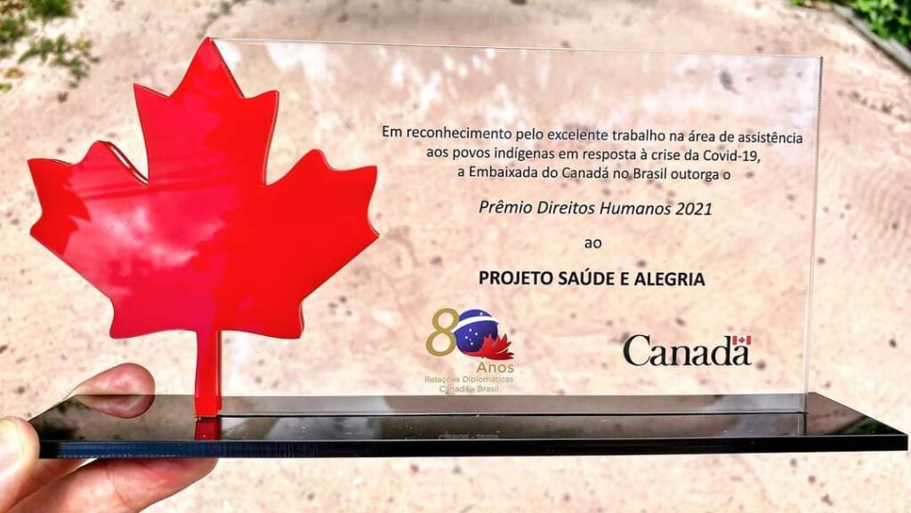 Graças ao empenho de diferentes atores que integram a campanha, a embaixada do Canadá, que também apoiou as ações, fez questão de premiar a iniciativa, ressaltando que “Por meio desses laços de amizade, o diálogo entre nossas nações se enriqueceu, proporcionando trocas de experiências e colaborações para promoção dos direitos humanos nos dois países” e que “Em reconhecimento pelo excelente trabalho na área de assistência aos povos indígenas em resposta à crise da Covid-19, a Embaixada do Canadá no Brasil outorga o Prêmio Direitos Humanos 2021 ao Projeto Saúde e Alegria” – escreveu a embaixadora, Jennifer May.