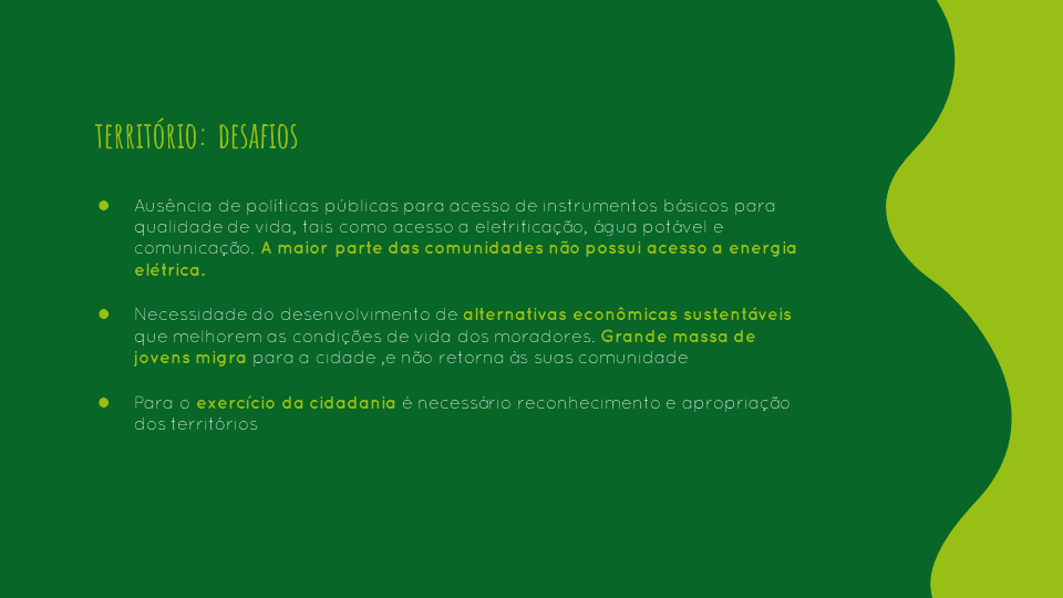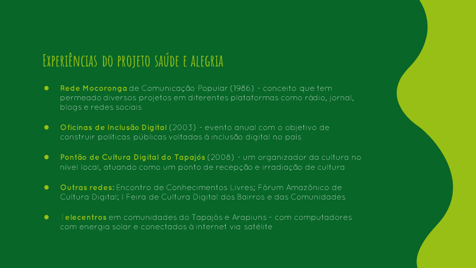 São grupos organizados para realizar sonhos coletivos para o território, onde partilham conhecimentos e expressam o desejo de conquistar o direito ao uso da internet, ao acesso de tecnologias para participação social, participação em rádios comunitárias e processos formativos de comunicação.