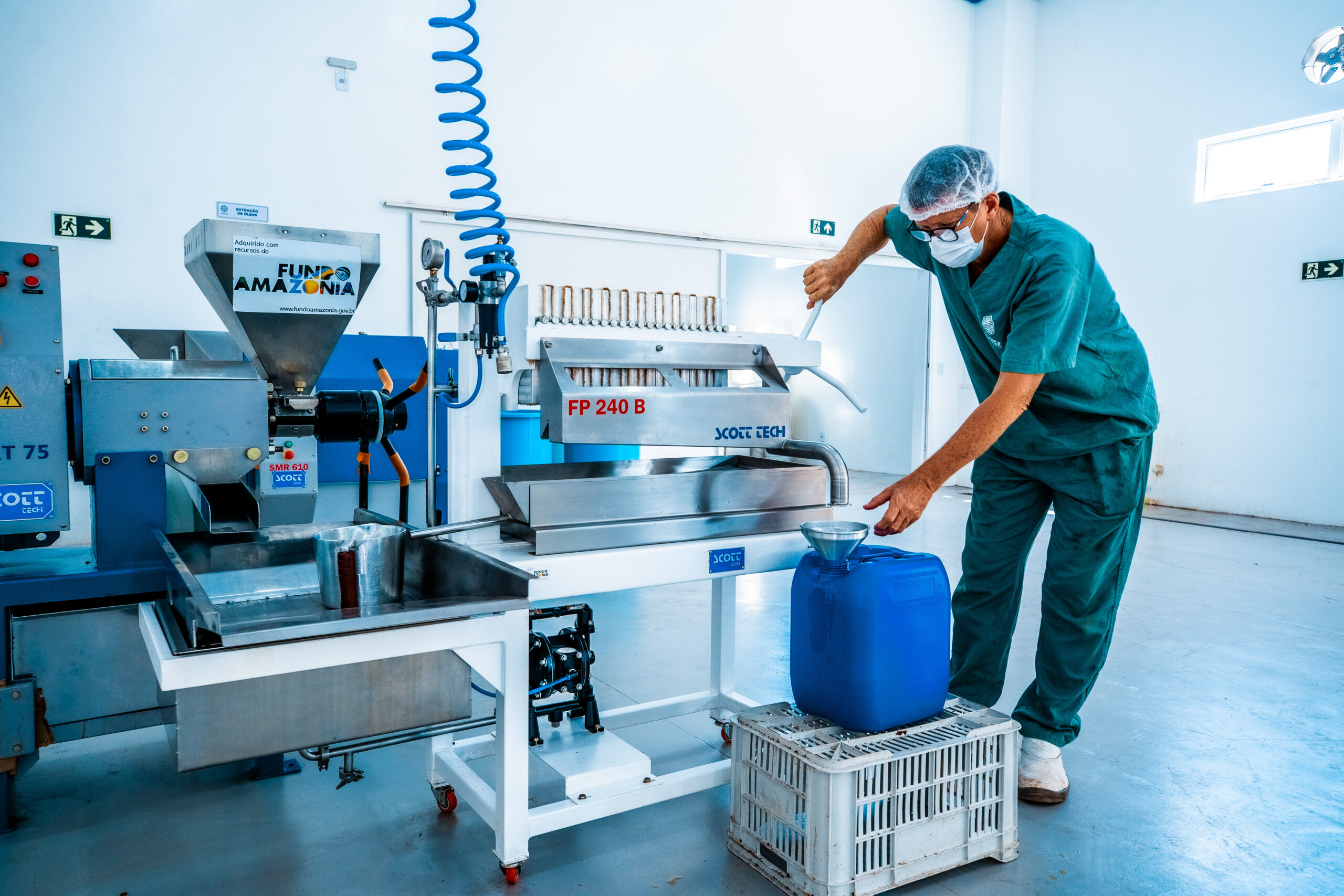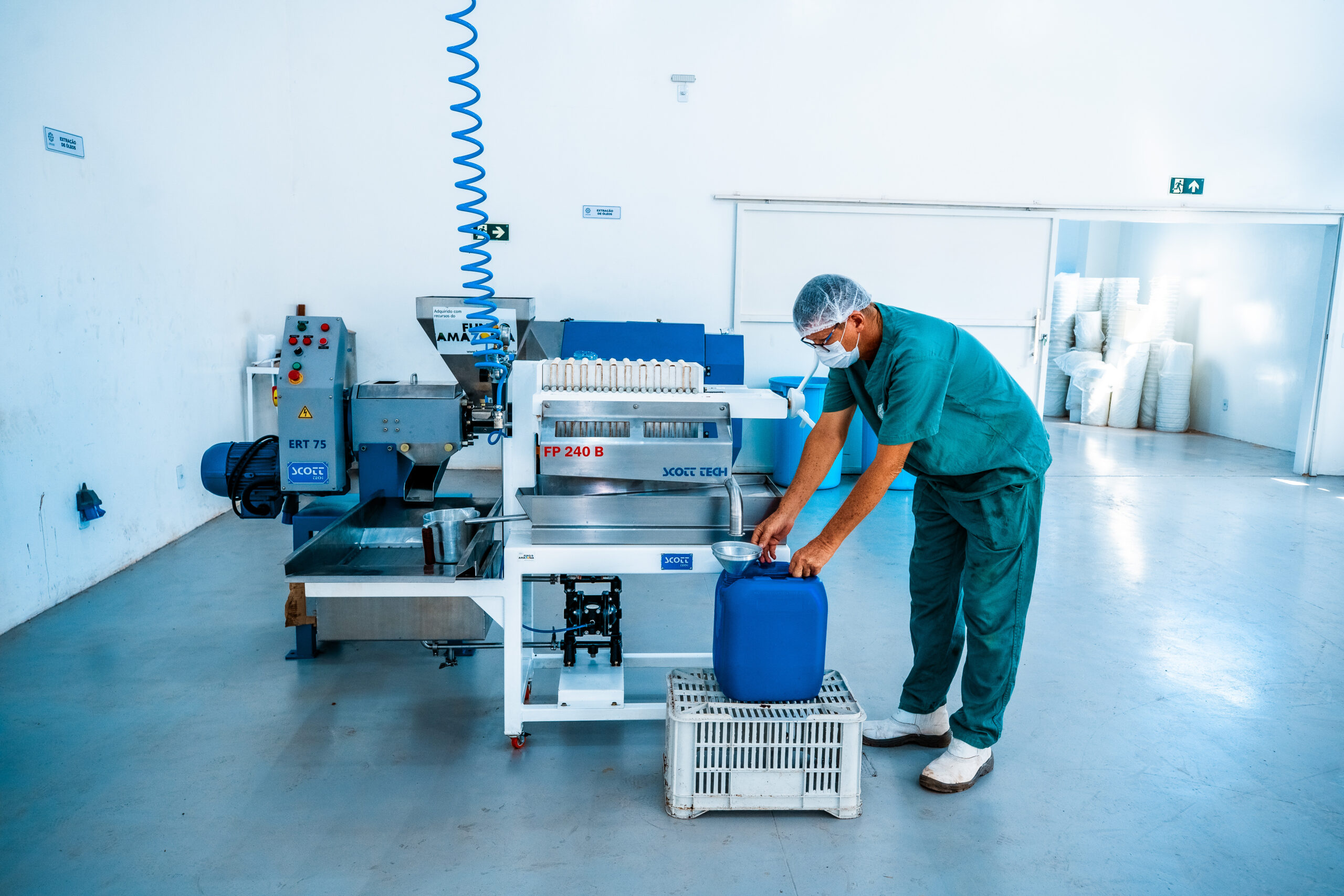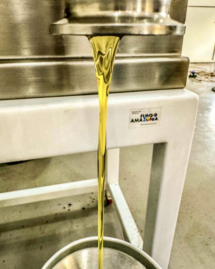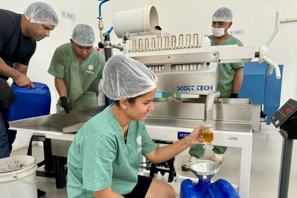 - Agroindústria – Galpão de Beneficiamento: Nesse espaço, os técnicos operam máquinas para processar óleo de andiroba, semente de cupuaçu e óleo de copaíba. Esses produtos são essenciais para a economia local e têm grande potencial de mercado.