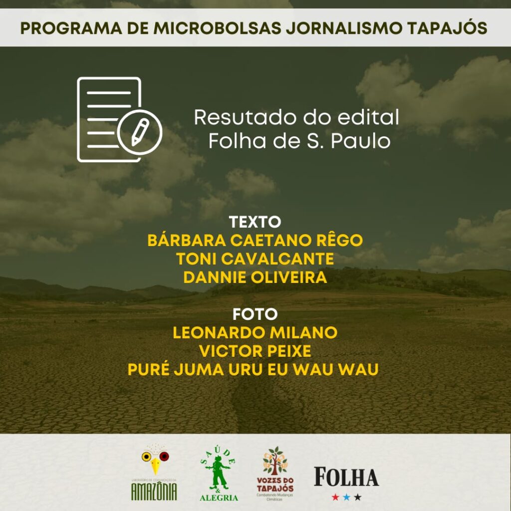 O Projeto Saúde e Alegria/Projeto VAC Tapajós e o O Laboratório de Comunicação Amazônia, em parceria com a Folha de S.Paulo, anunciam o resultado da terceira chamada pública do Programa de Microbolsas Jornalismo Tapajós, que vai apoiar a produção de três reportagens em texto mais três coberturas fotográficas relacionadas sobre a crise climática na região.