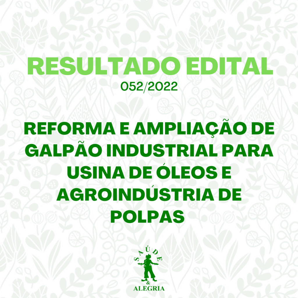 O Centro de Estudos Avançados de Promoção Social e Ambiental – CEAPS torna público o resultado do TERMO DE REFERÊNCIA (Nº 052/2022) para contratação de empresa de engenharia especializada para reforma e ampliação de galpão industrial para futura usina de óleos e agroindústria de polpas de frutas, localizado na sede da Cooperativa dos Trabalhadores Agroextrativistas do Oeste do Pará, Município de Santarém.