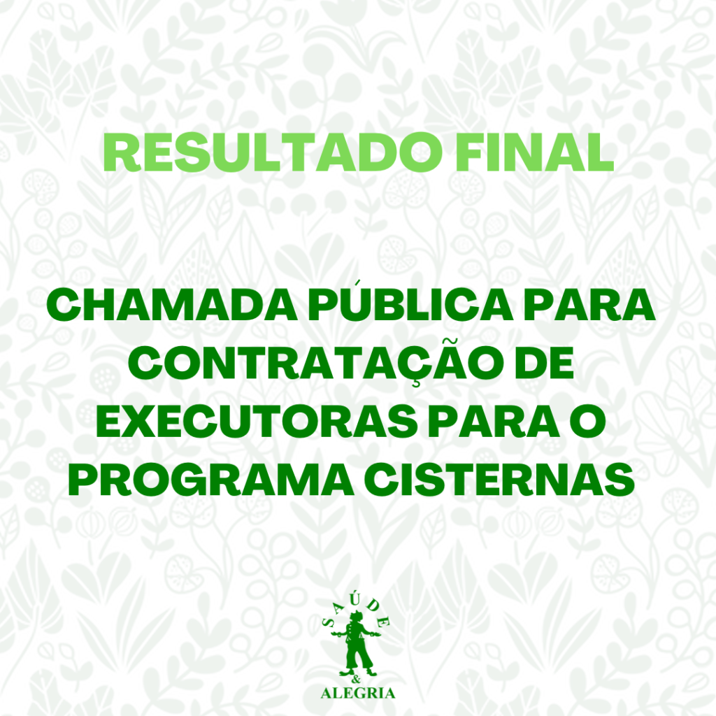 O Centro de Estudos Avançados de Promoção Social e Ambiental – CEAPS, inscrito no CNPJ sob o número 55.233.555/0001-75, com sede na Avenida Mendonça Furtado, 3979, Bairro Liberdade, Município de Santarém, Estado do Pará, doravante denominado CEAPS, tendo em vista o constante no Termo de Colaboração MDS no 945310/2023 Transferegov no 046349/2023, torna público o resultado FINAL do EDITAL DE CHAMADA PÚBLICA para a seleção e contratação de entidades privadas sem fins lucrativos para a implementação das seguintes tecnologias sociais: TS no 7 – Sistema pluvial multiuso comunitário, TS no 8 – Sistema pluvial multiuso autônomo, TS no 24 – Sistema pluvial multiuso autônomo com serviço de acompanhamento familiar para inclusão social e produtiva, TS no 25 – Sistema pluvial multiuso comunitário com serviço de acompanhamento familiar para inclusão social e produtiva, observadas as disposições da Lei Federal no 12.873/2013, do Decreto no 9.606/2018, da Portaria MC no 22, de 6 de abril de 2020, da Portaria MDS no 885, de 23 de maio de 2023 e da Portaria no 923, de 04 de outubro de 2023 ou normativo que venha a substituí-lo, e das Instruções Normativas SESAN/MDS No 21, No 26, No 24 e No 25, de 15 de maio de 2023, e em consonância com as diretrizes e critérios descritos no Edital de Chamada Pública.