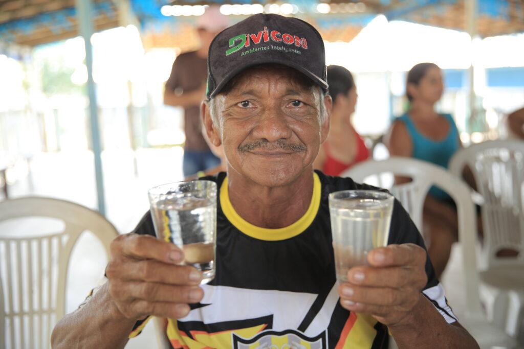 Seu Moacir mostrando água filtrada pela nanotecnologia e água que a comunidade tem acesso – Foto: Júnior Albuquerque