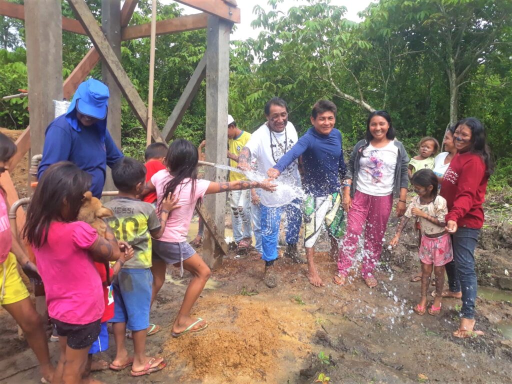 • Aldeia Waró Baxé Watpu: Perfuração de poço com 55 metros, instalação de bomba submersa, rede de distribuição, sistema de energia solar para bombeamento e elevado de madeira com reservatório de 5mil litros;