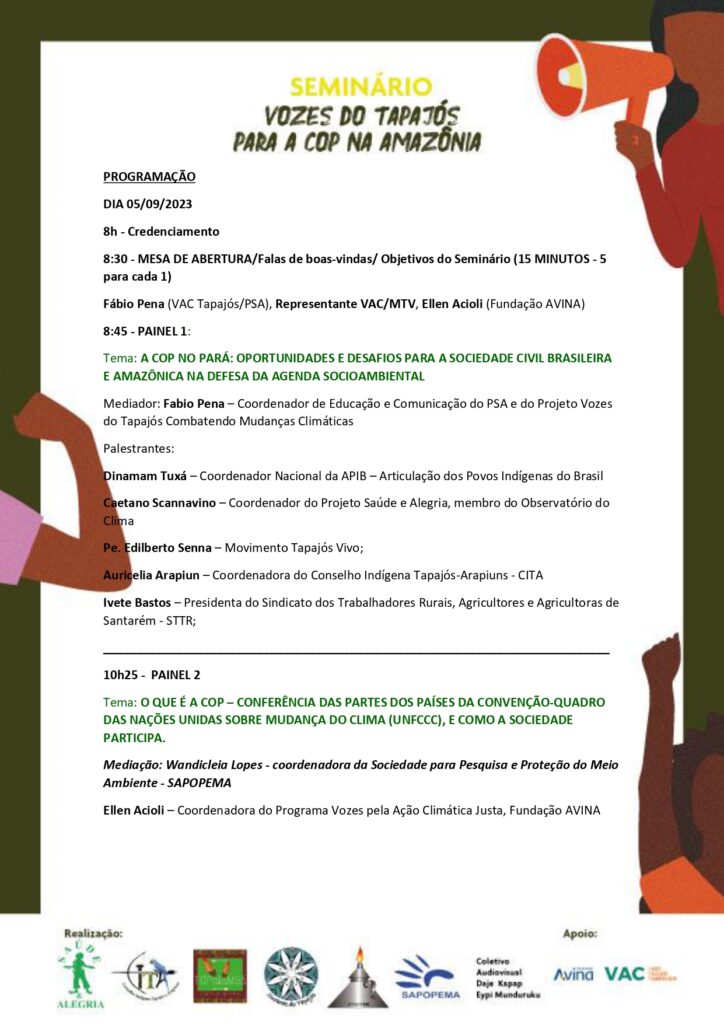 Nesse contexto de uma importante oportunidade em meio ao reposicionamento político do país diante da emergência climática, após vários anos de desmonte das políticas socioambientais, a Coalizão Vozes do Tapajós Combatendo as Mudanças Climáticas e demais parceiros estão propondo o seminário ‘Vozes do Tapajós para a COP na Amazônia’.