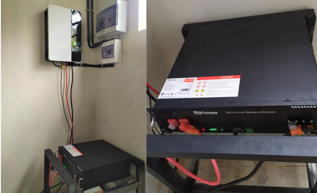 O gerador off grid instalado na UBS é completamente independente de qualquer ligação com a rede elétrica, utilizando apenas a energia solar produzida pelos painéis fotovoltaicos. A energia produzida é imediatamente consumida pelas cargas do sistema e seu excedente é armazenado na bateria. O equipamento responsável por fazer o gerenciamento dessa produção/consumo é o inversor carregador (que agrega um controlador de carga solar MPPT), onde é feito a conversão da corrente contínua geradas pelos painéis para a corrente alternada demandada pelas cargas.