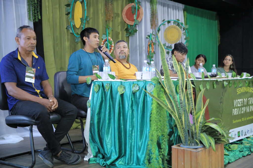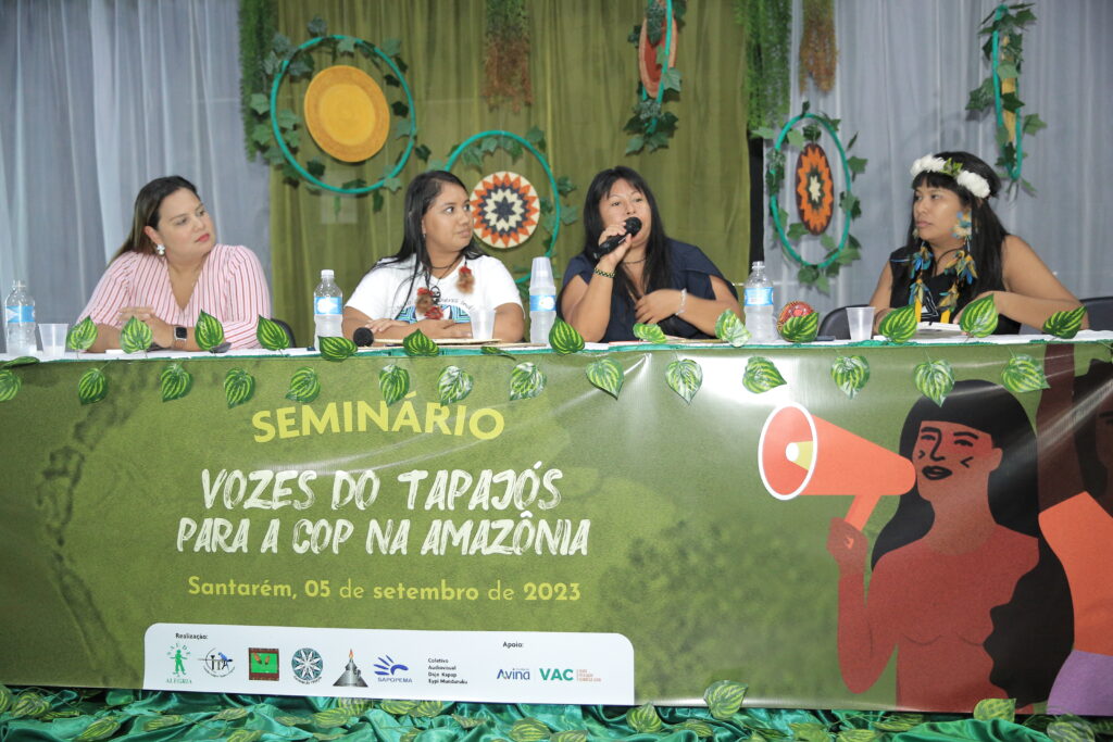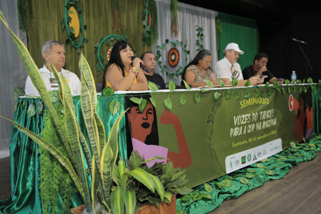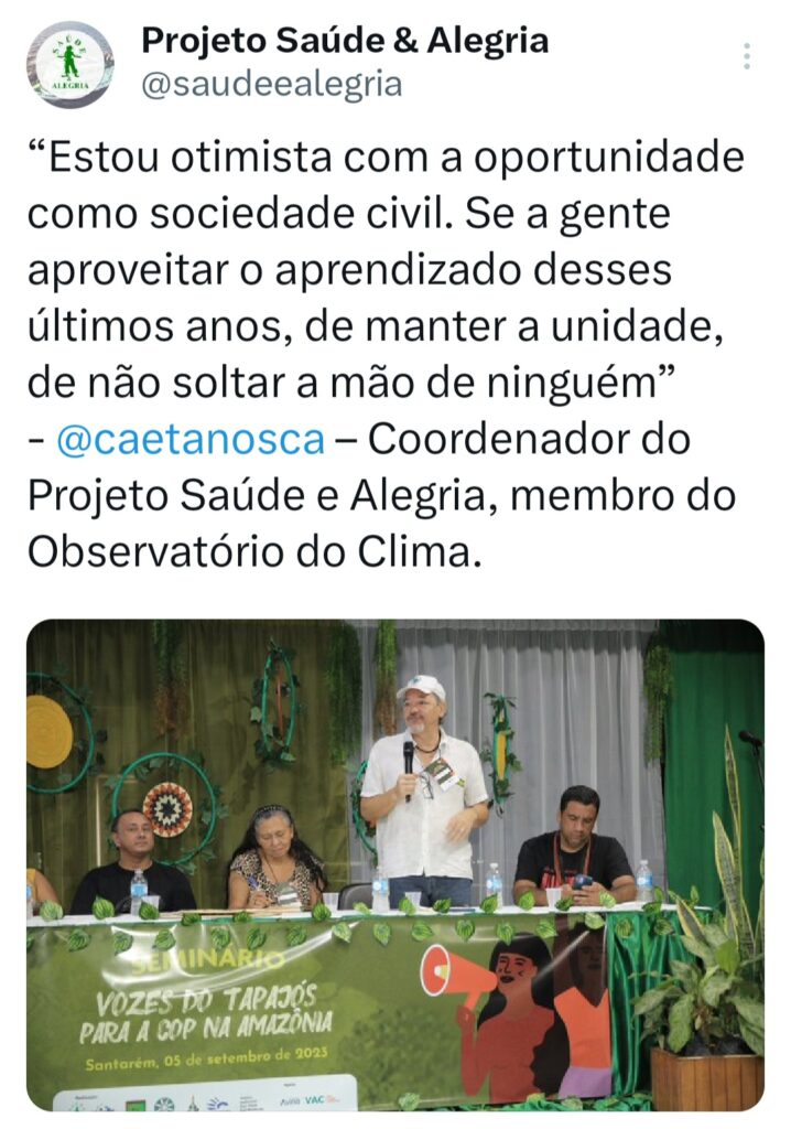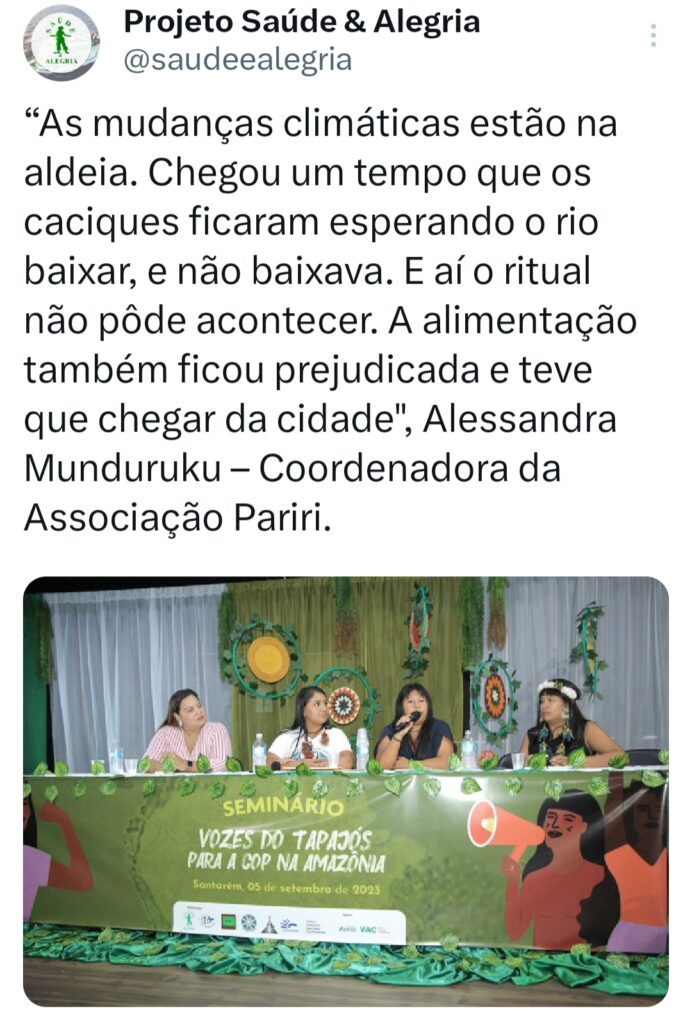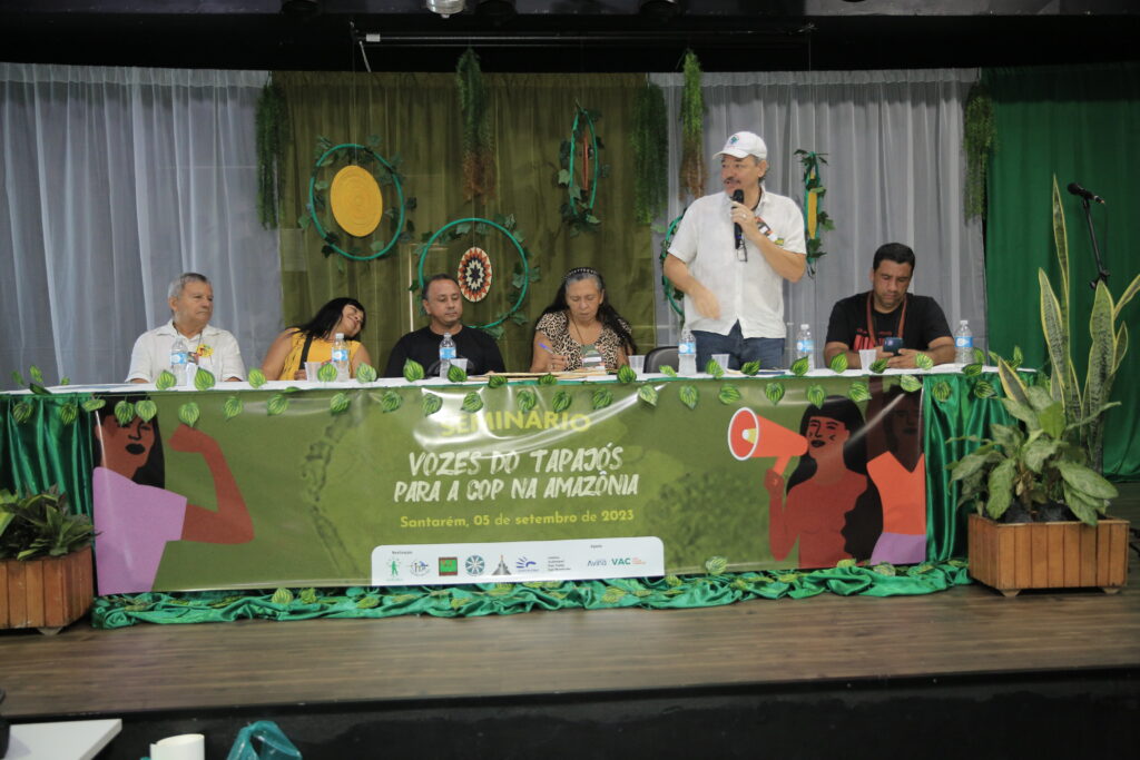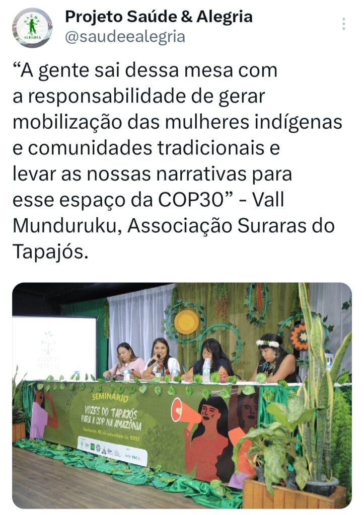 O seminário ‘Vozes do Tapajós para a COP na Amazônia’ foi organizado pela Coalizão Vozes do Tapajós Combatendo as Mudanças Climáticas coordenado pelo Projeto Saúde e Alegria, Sapopema, CITUPI, CITA, STTR-STM, SURARAS e Coletivo Daje Kapap Eipi.