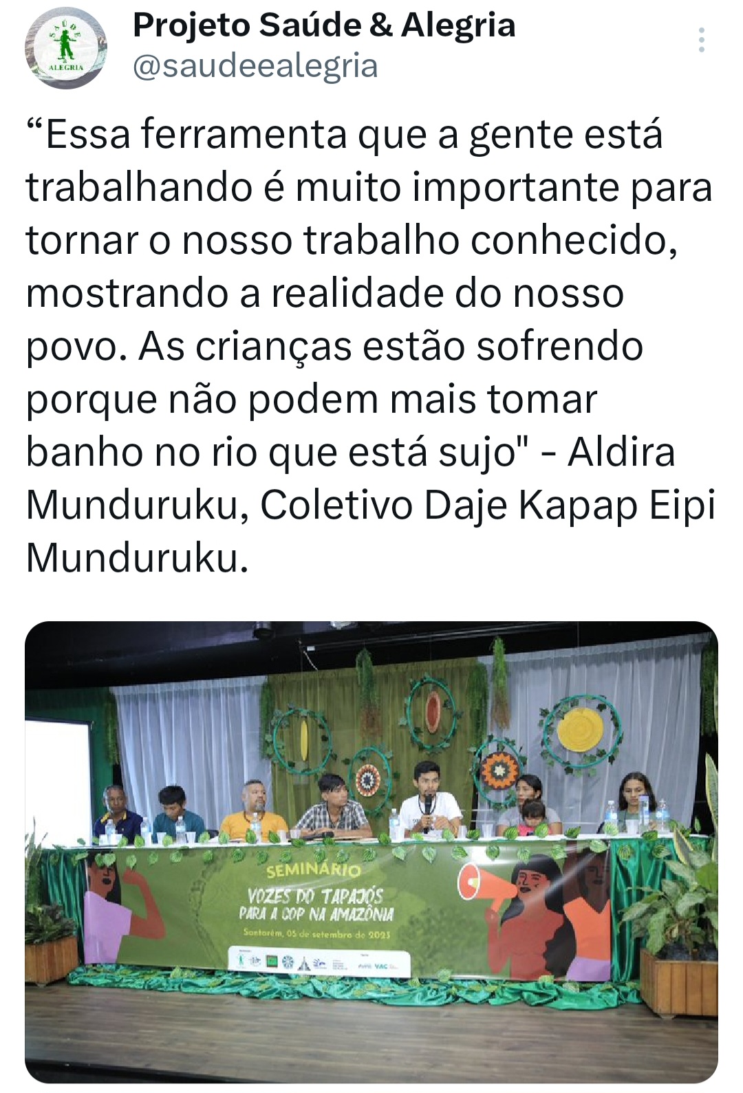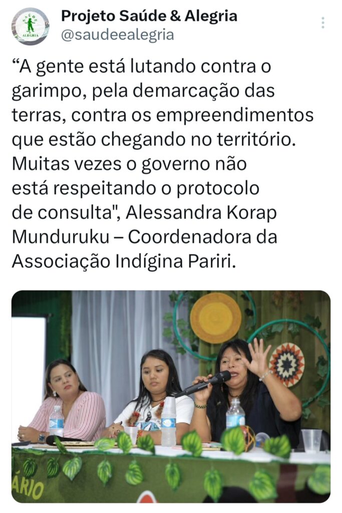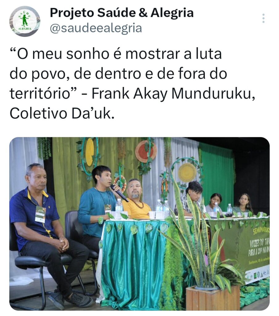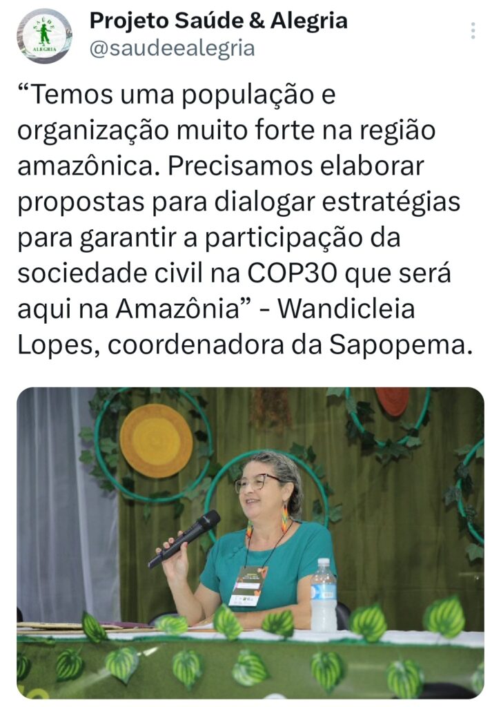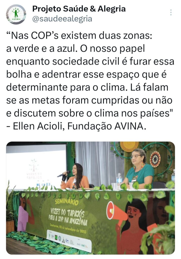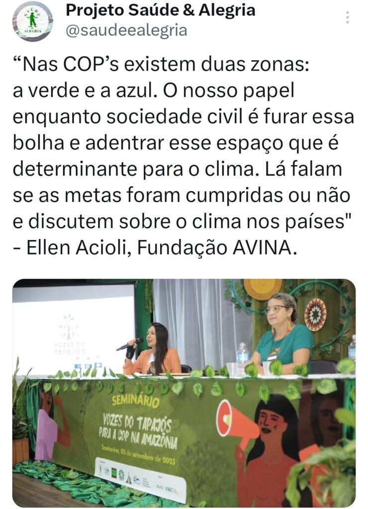 O seminário ‘Vozes do Tapajós para a COP na Amazônia’ foi organizado pela Coalizão Vozes do Tapajós Combatendo as Mudanças Climáticas coordenado pelo Projeto Saúde e Alegria, Sapopema, CITUPI, CITA, STTR-STM, SURARAS e Coletivo Daje Kapap Eipi.