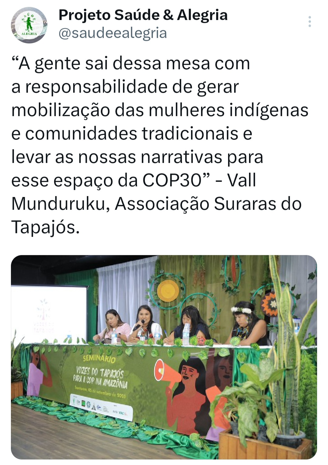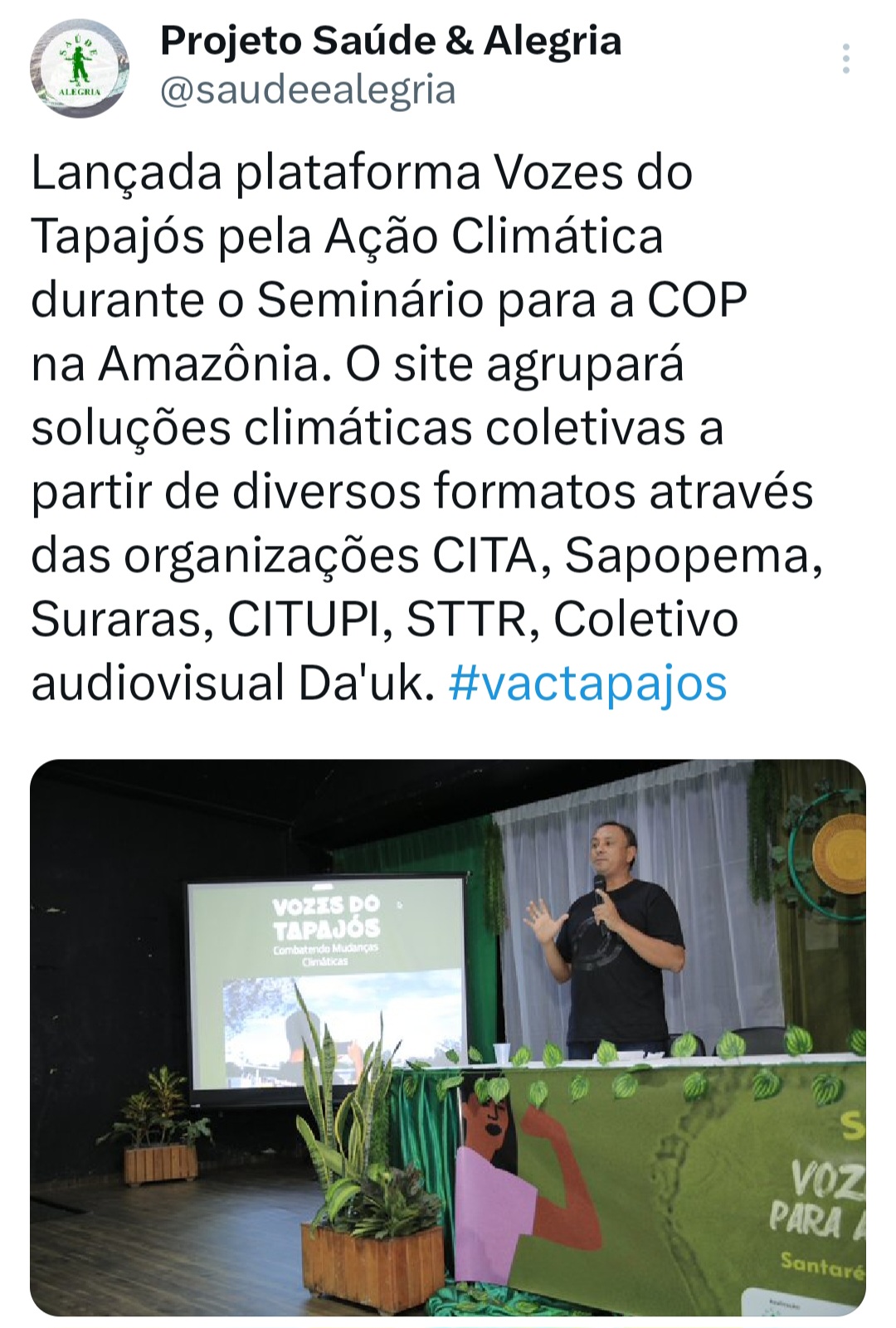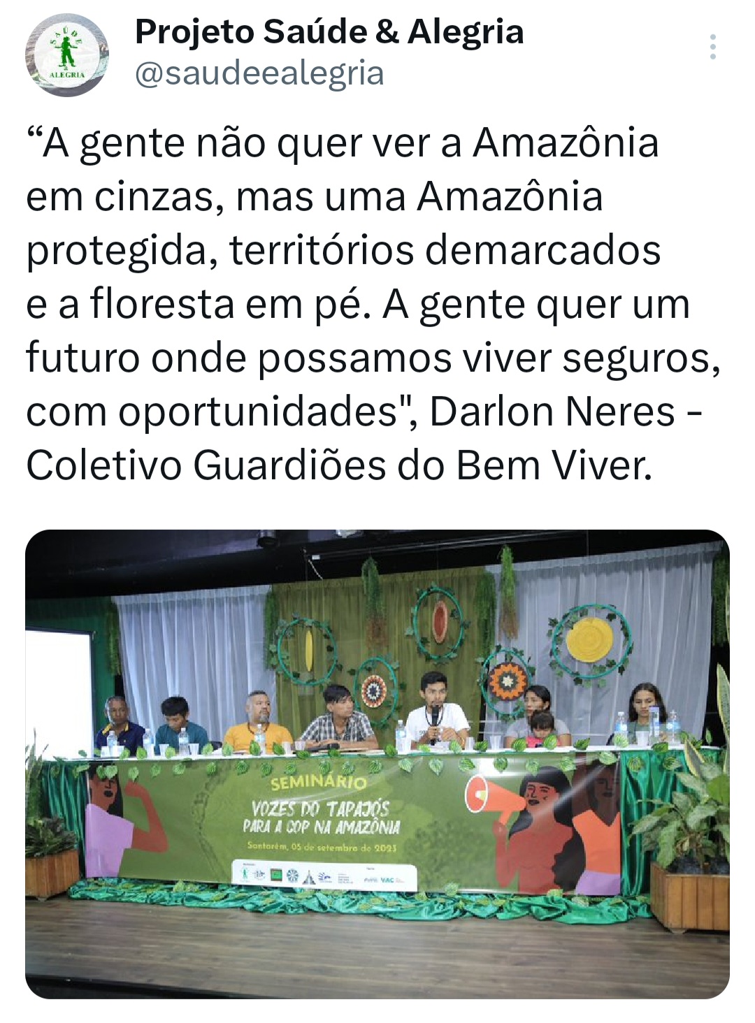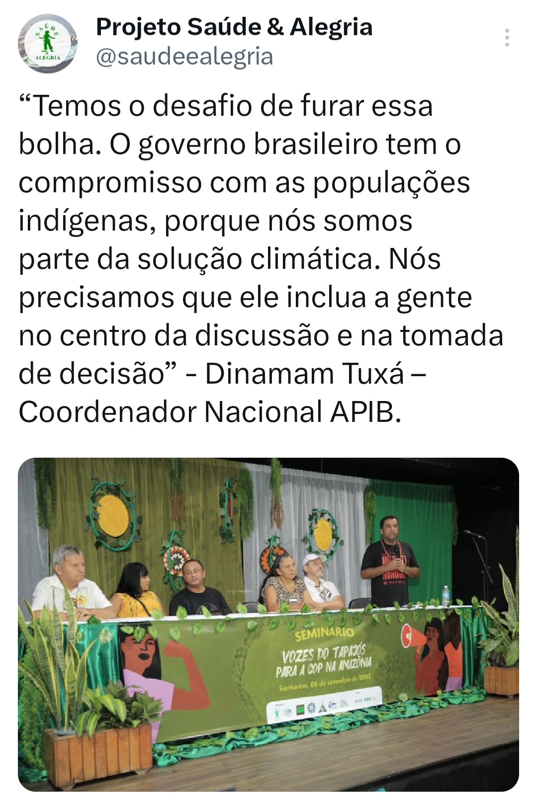 O seminário ‘Vozes do Tapajós para a COP na Amazônia’ foi organizado pela Coalizão Vozes do Tapajós Combatendo as Mudanças Climáticas coordenado pelo Projeto Saúde e Alegria, Sapopema, CITUPI, CITA, STTR-STM, SURARAS e Coletivo Daje Kapap Eipi.