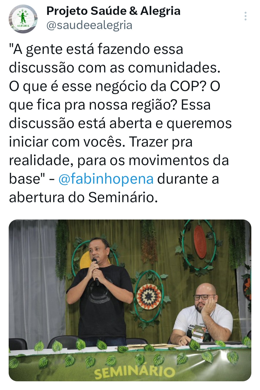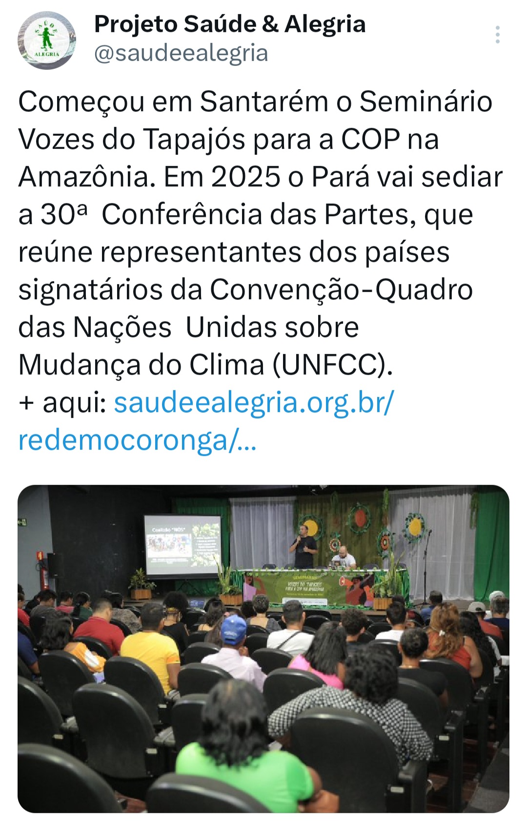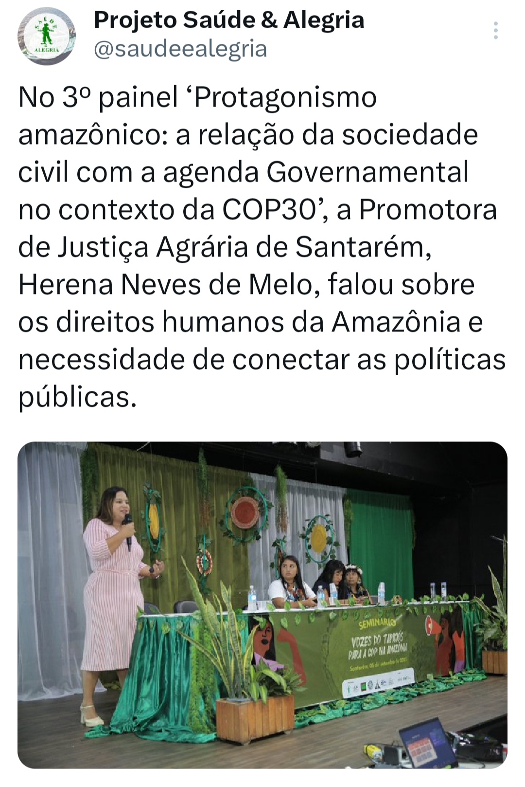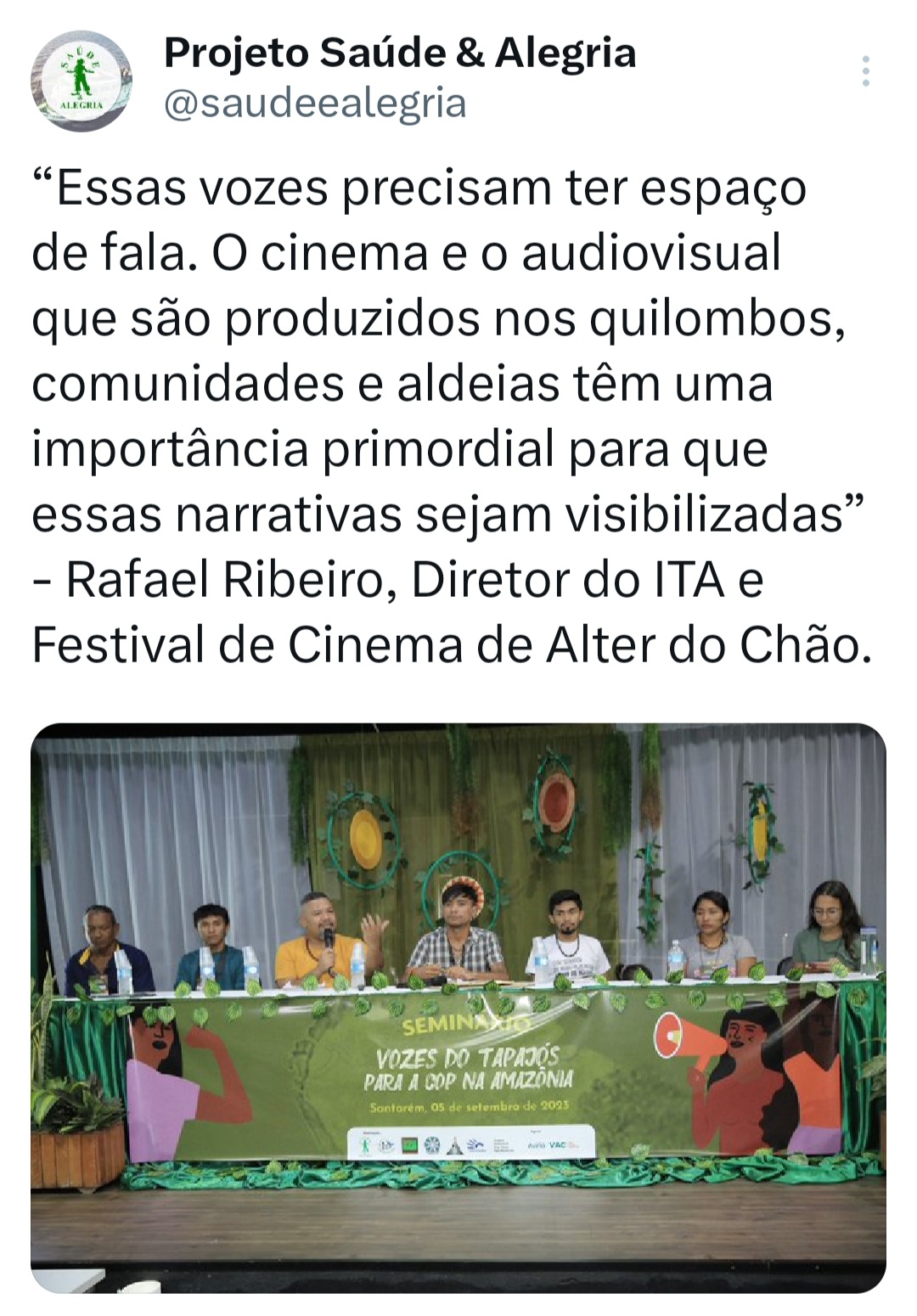 O seminário ‘Vozes do Tapajós para a COP na Amazônia’ foi organizado pela Coalizão Vozes do Tapajós Combatendo as Mudanças Climáticas coordenado pelo Projeto Saúde e Alegria, Sapopema, CITUPI, CITA, STTR-STM, SURARAS e Coletivo Daje Kapap Eipi.
